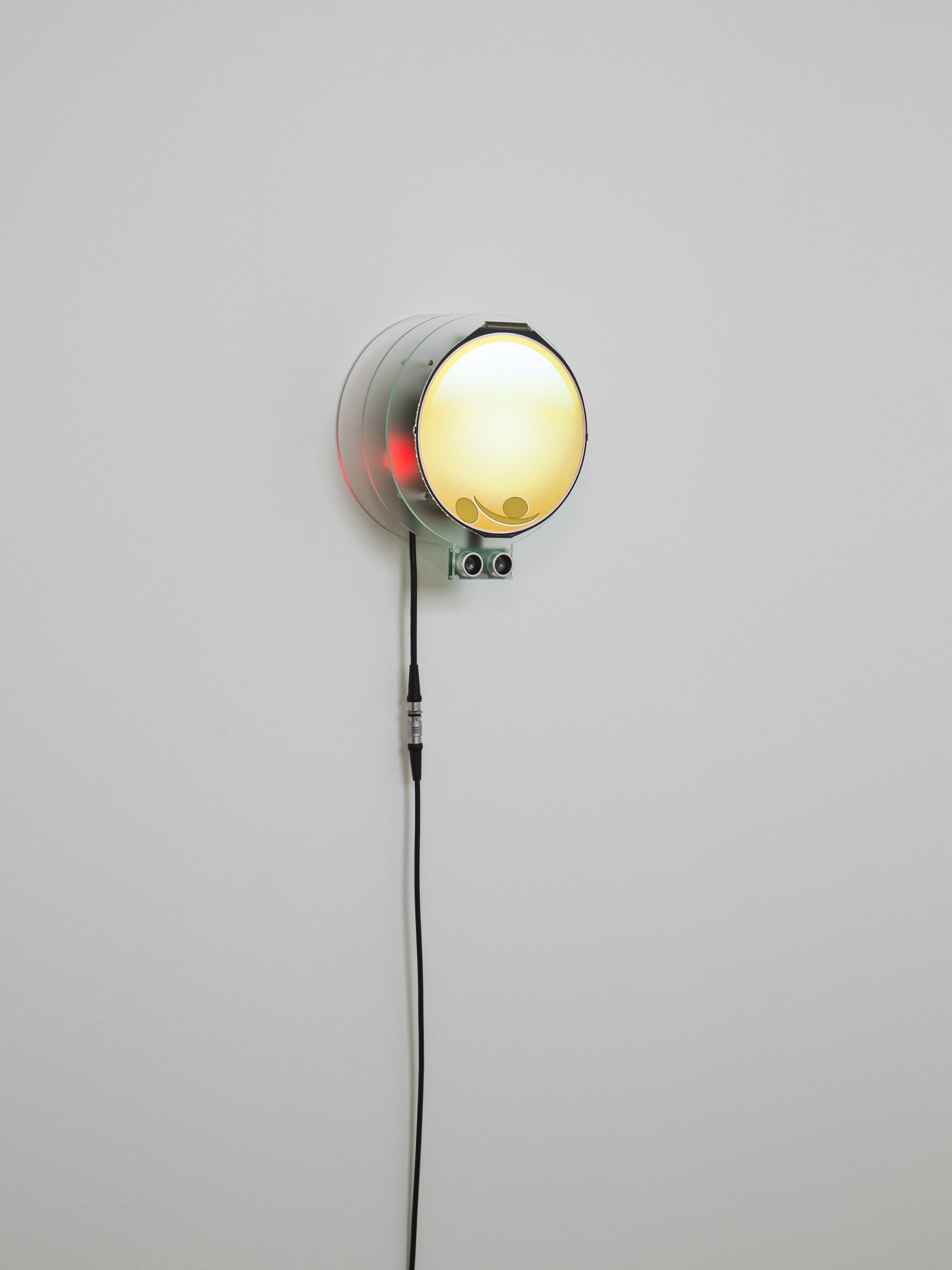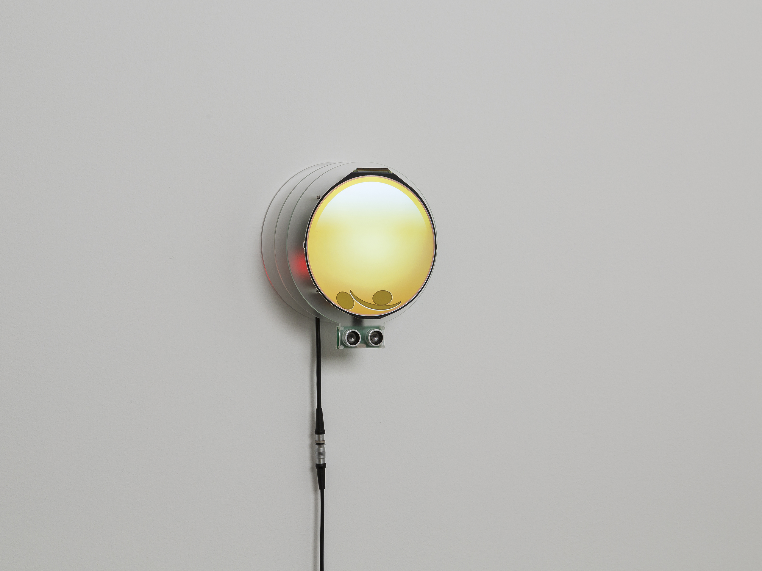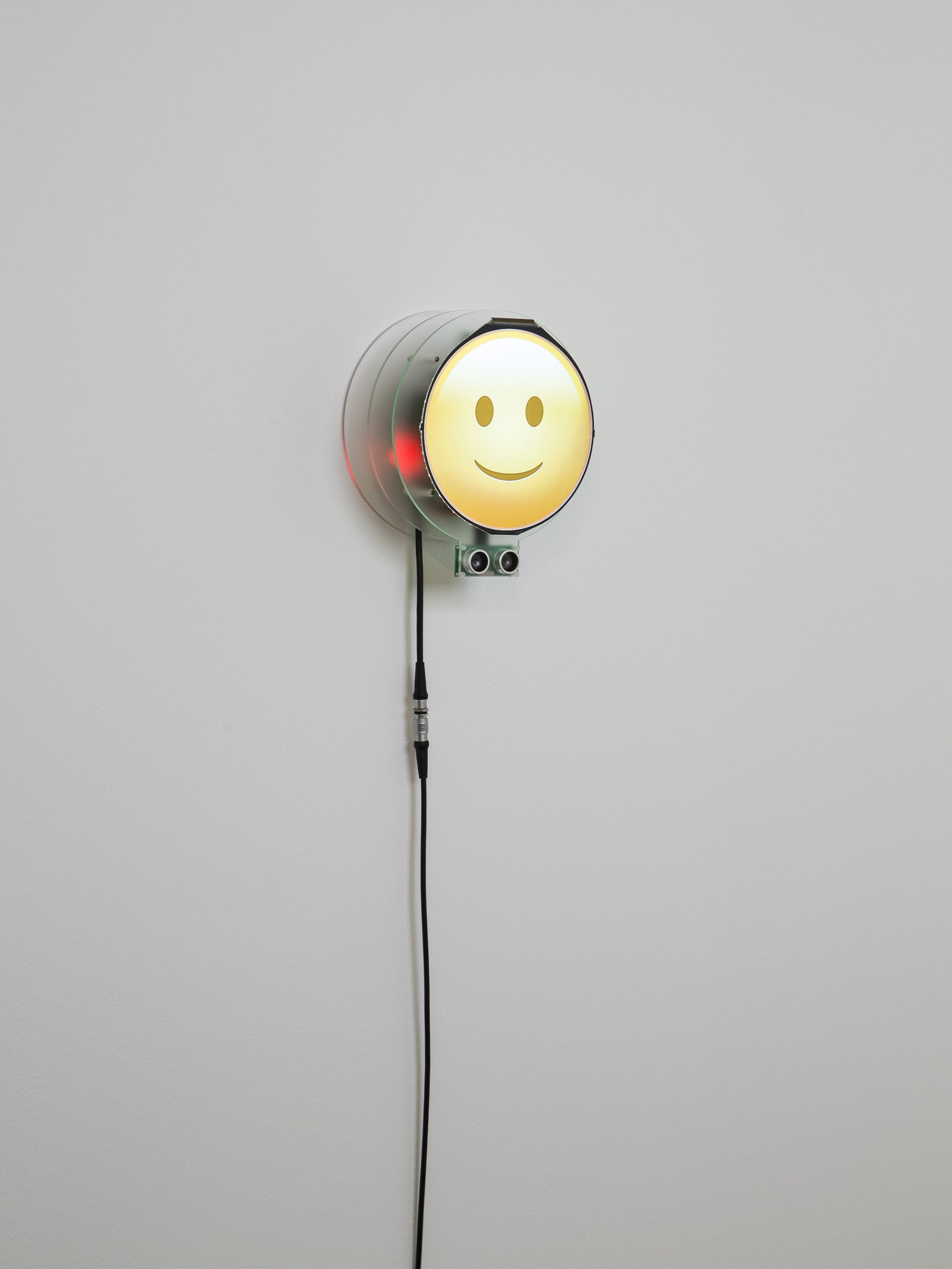 The round screen displays the “Slightly Smiling Face” emoji. When the viewer approaches within 1 meter, the smile collapses instantly.