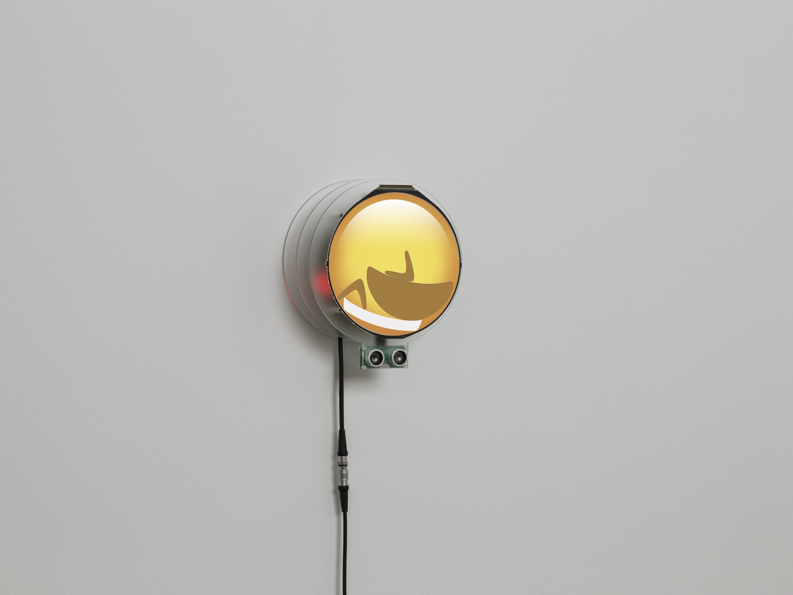 The round screen displays the “Smiling Face” emoji. When the viewer approaches within 1 meter, the smile collapses instantly.
