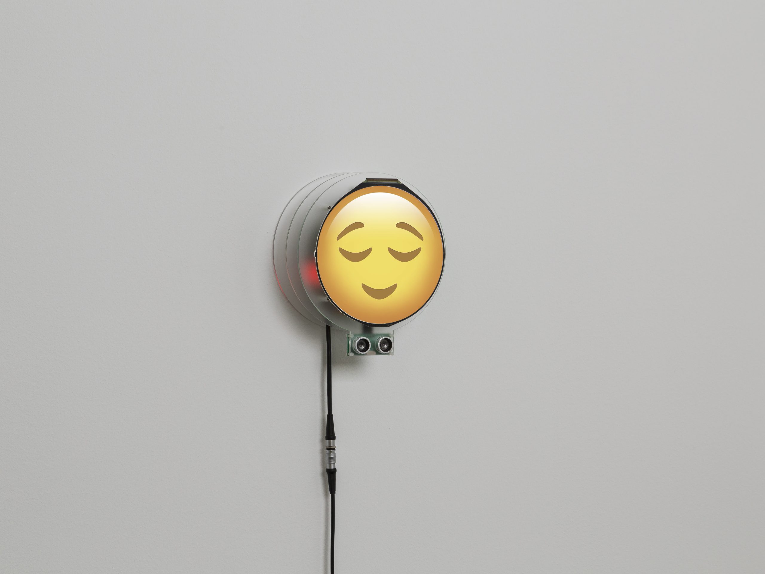 The round screen displays the “Smiling Face” emoji. When the viewer approaches within 1 meter, the smile collapses instantly.