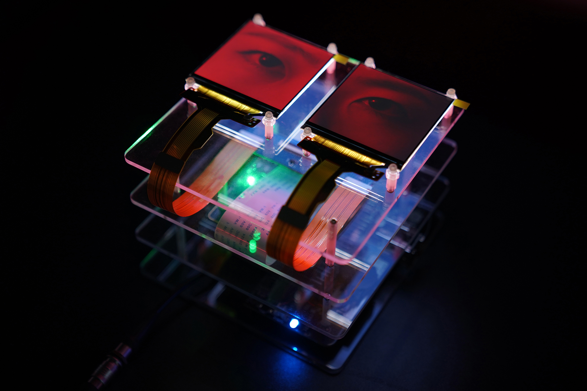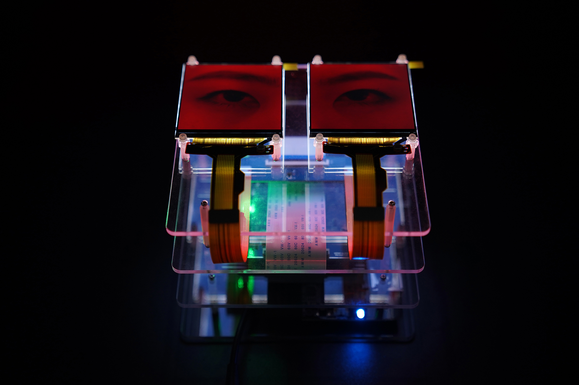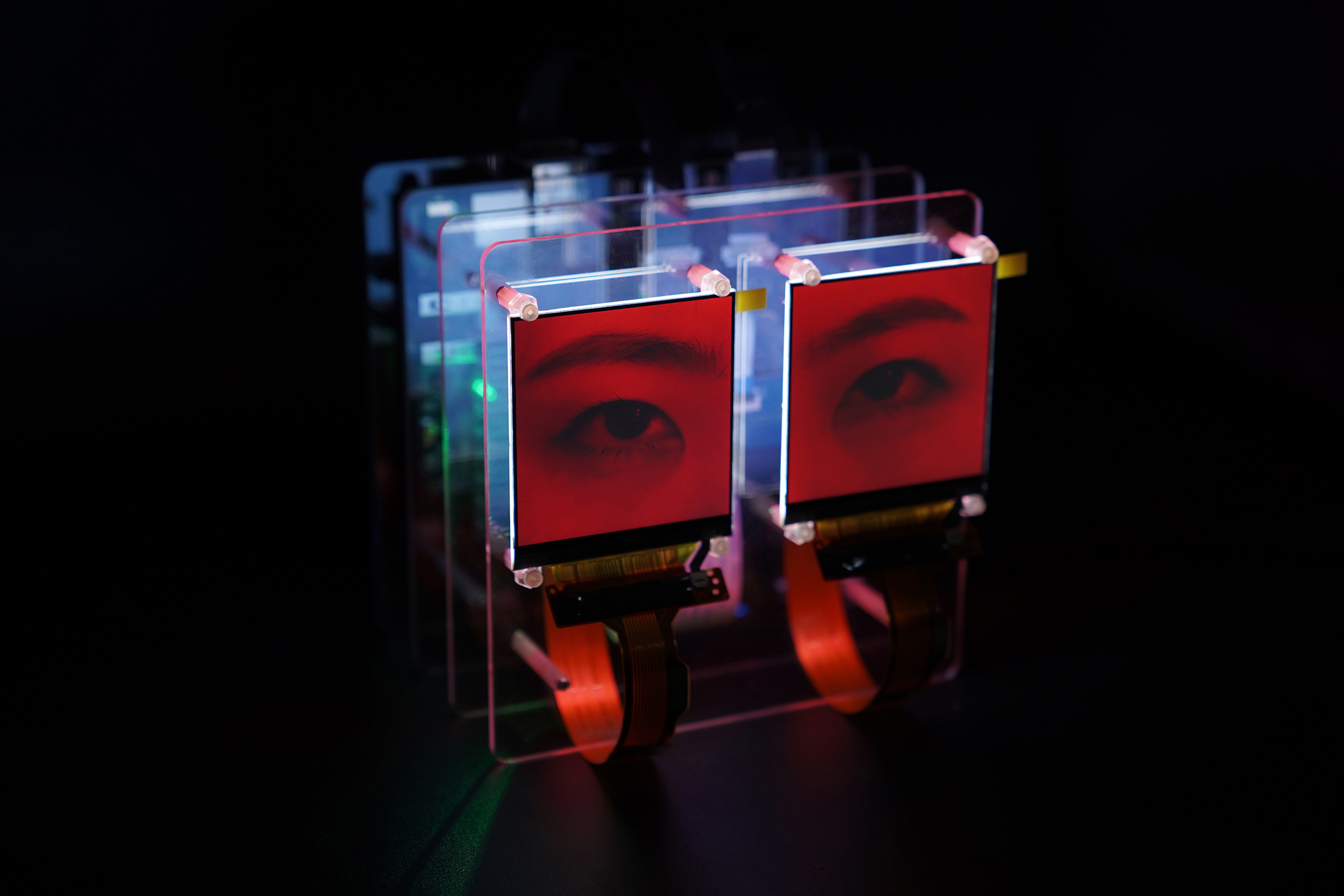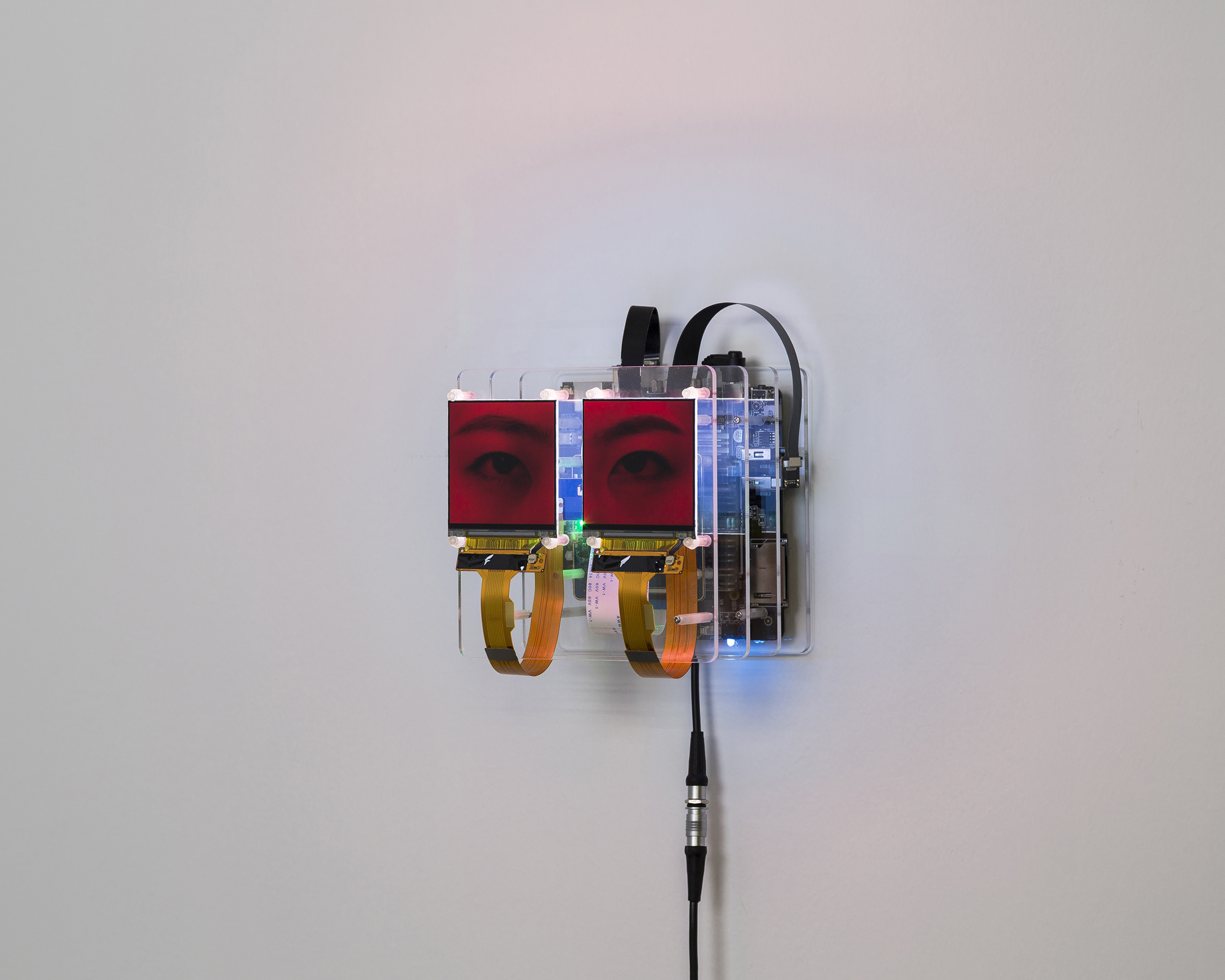 The Abyss Watchers No.1 reassembles discarded screen pieces of VR headsets and reasserts fragmented video footage of human models. Fathoming the profound engagement and intervention of digital media in our lived experience, this work offers a prophetical rendering of the futuristic Frankensteined species. The pair of eyes that commands the viewer’s self-awareness in consciousness unveils the rich facets of genuine human emotions, delineating the frailty of Artificial Intelligence in failing yet to emulate human emotions and contingency. Tinted in a wash of red light, the eyes are submerged in the apocalyptic ambiance referencing Stanley Kubrick’s 2001: A Space Odyssey (1968); its theatricality further complicates the ambiguous boundary between virtuality and reality.? ?