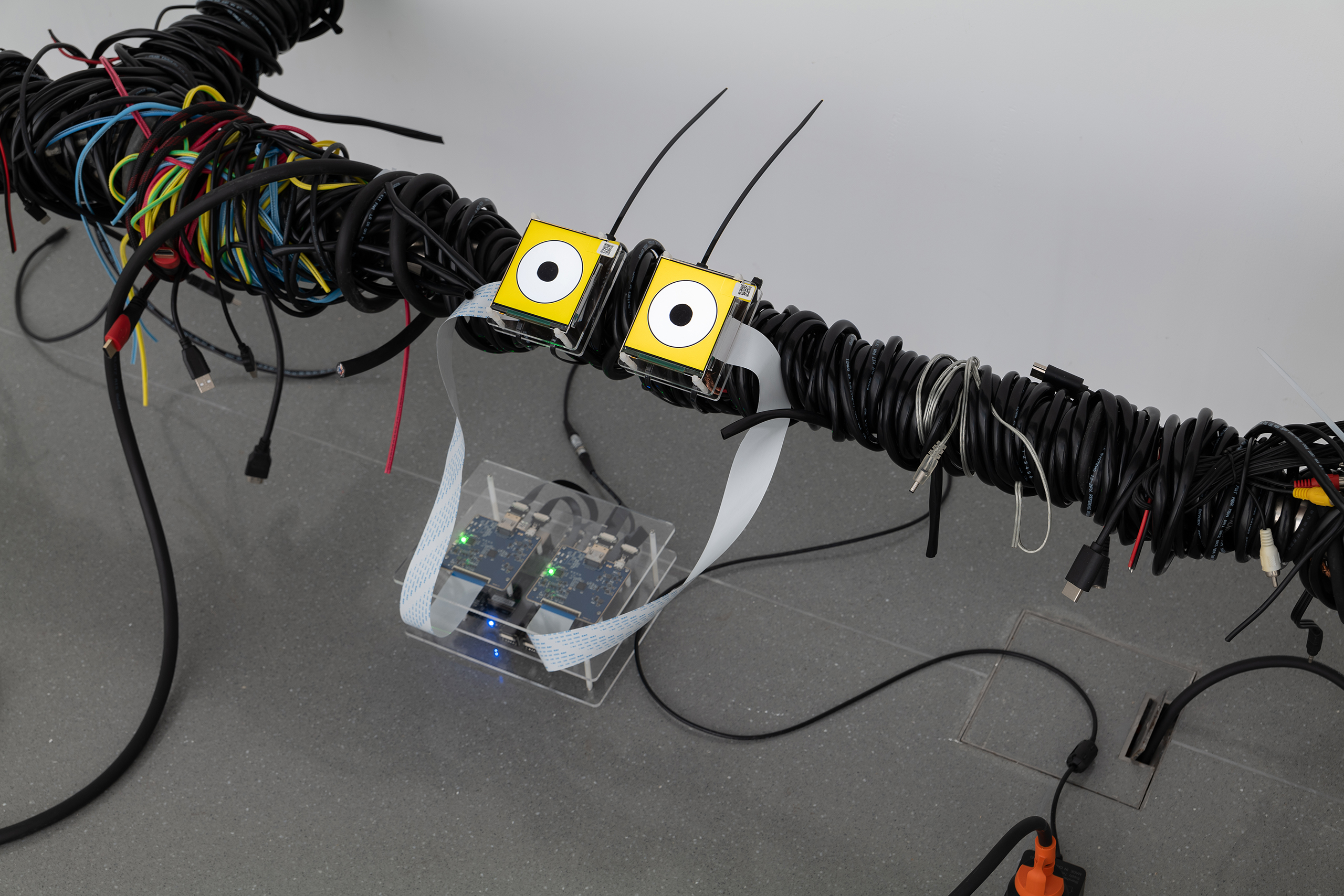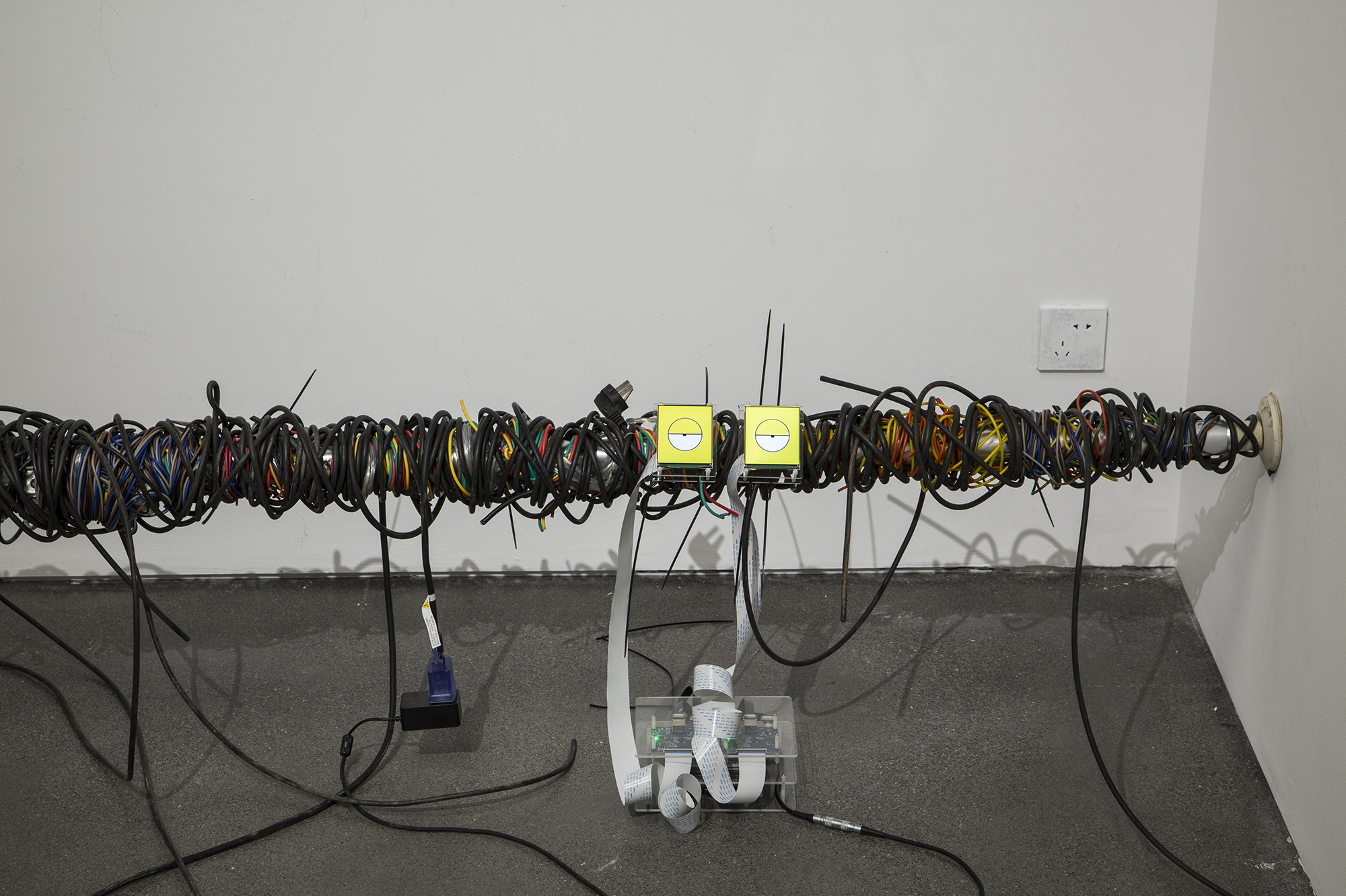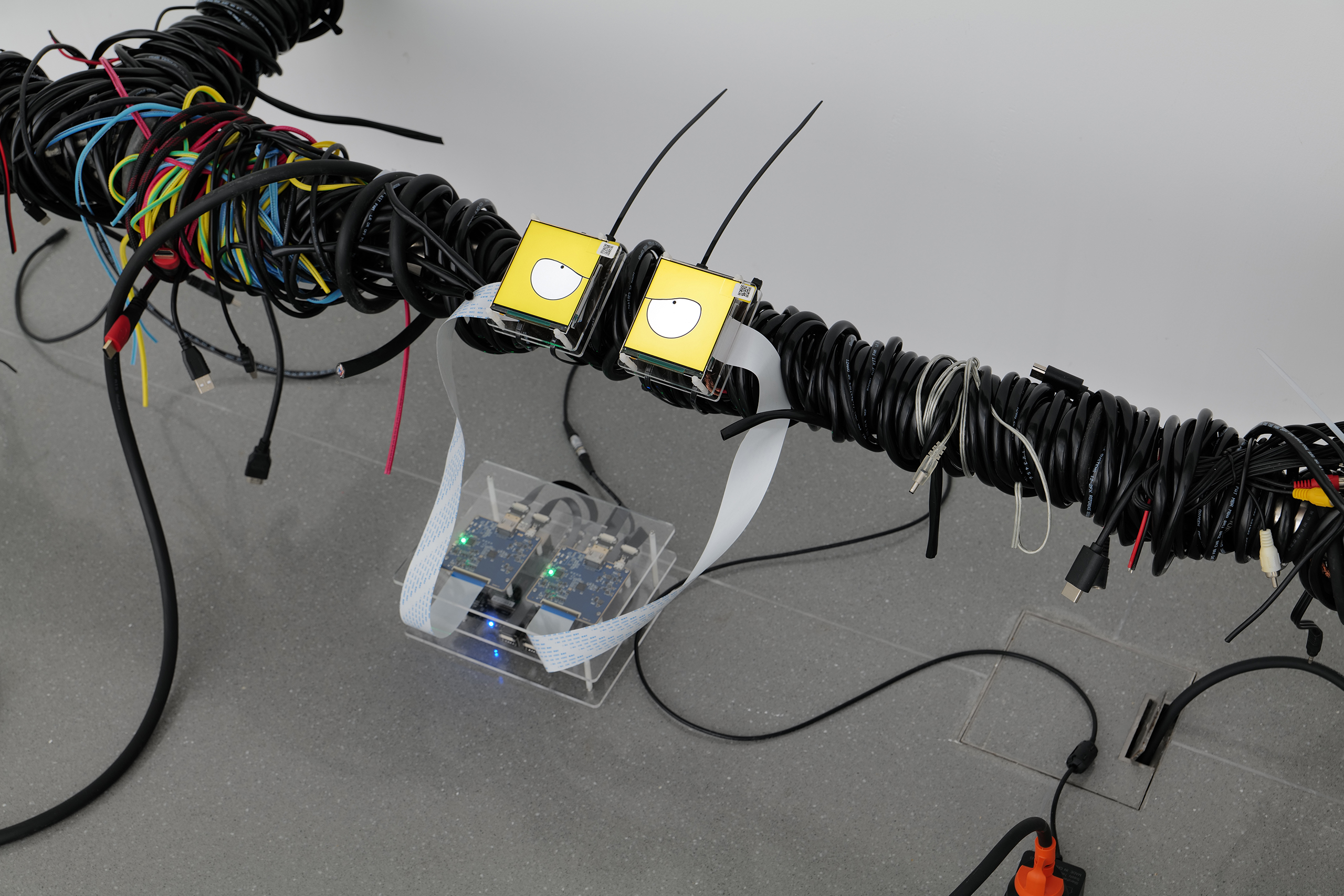 On a metal rod tightly wrapped with dense cables, a pair of screens continuously display animated eyes. These animations, each symbolizing different emotions, seem to have become emotional surrogates for the joys and sorrows of the users behind the screens, replacing genuine individual feelings with a flattened, kawaii-style universal expression. The use of VR headset screens in this work suggests a reverse gaze from the virtual world, while the mass of cables hints at the invisible, complex systems that operate behind the screen.