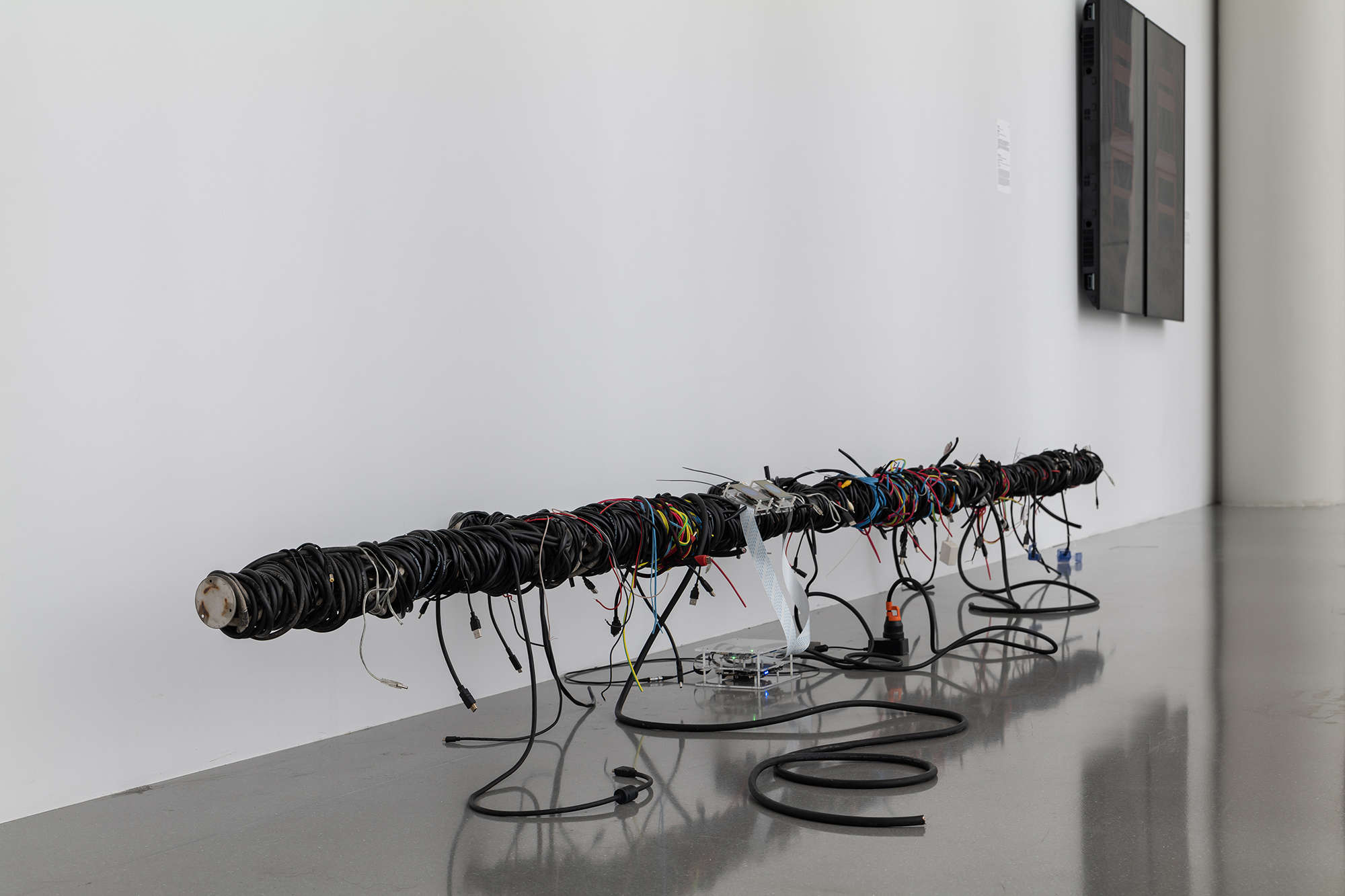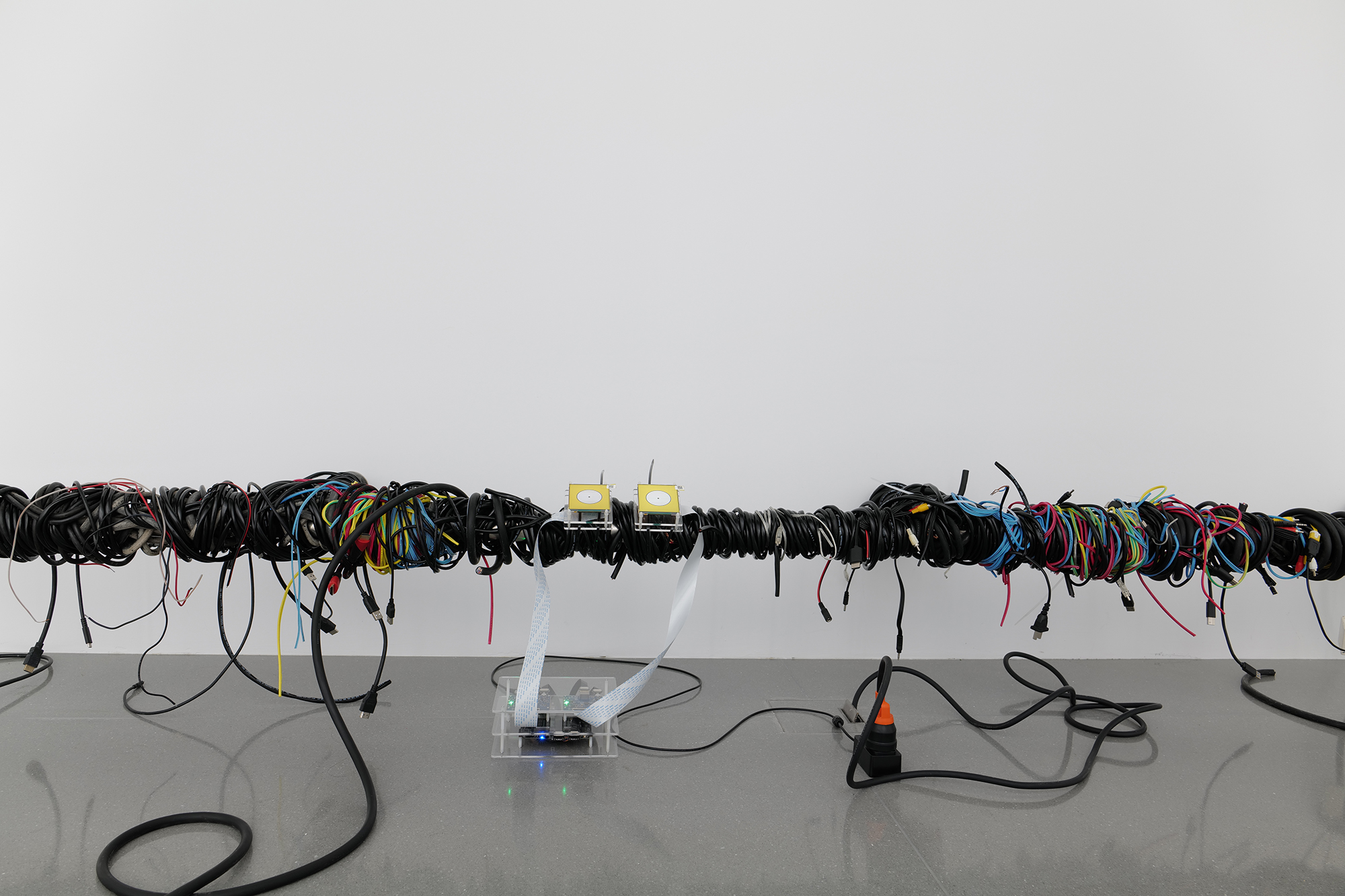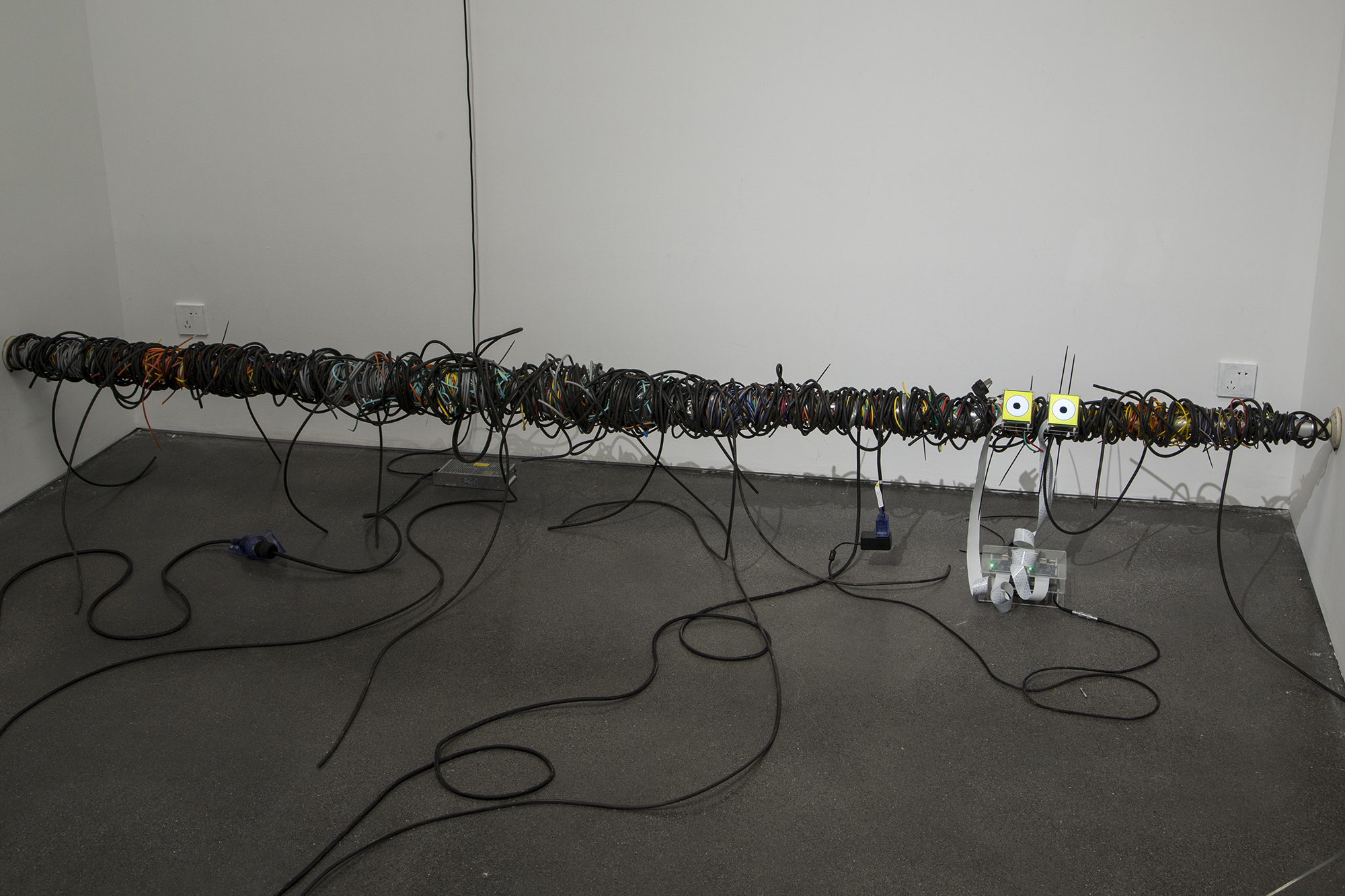 On a metal rod tightly wrapped with dense cables, a pair of screens continuously display animated eyes. These animations, each symbolizing different emotions, seem to have become emotional surrogates for the joys and sorrows of the users behind the screens, replacing genuine individual feelings with a flattened, kawaii-style universal expression. The use of VR headset screens in this work suggests a reverse gaze from the virtual world, while the mass of cables hints at the invisible, complex systems that operate behind the screen.