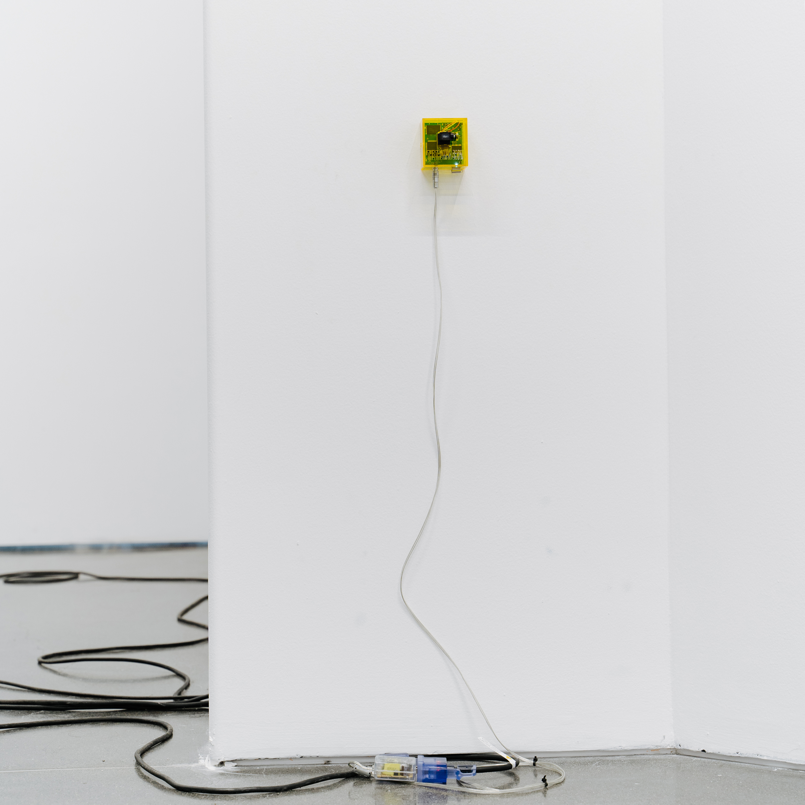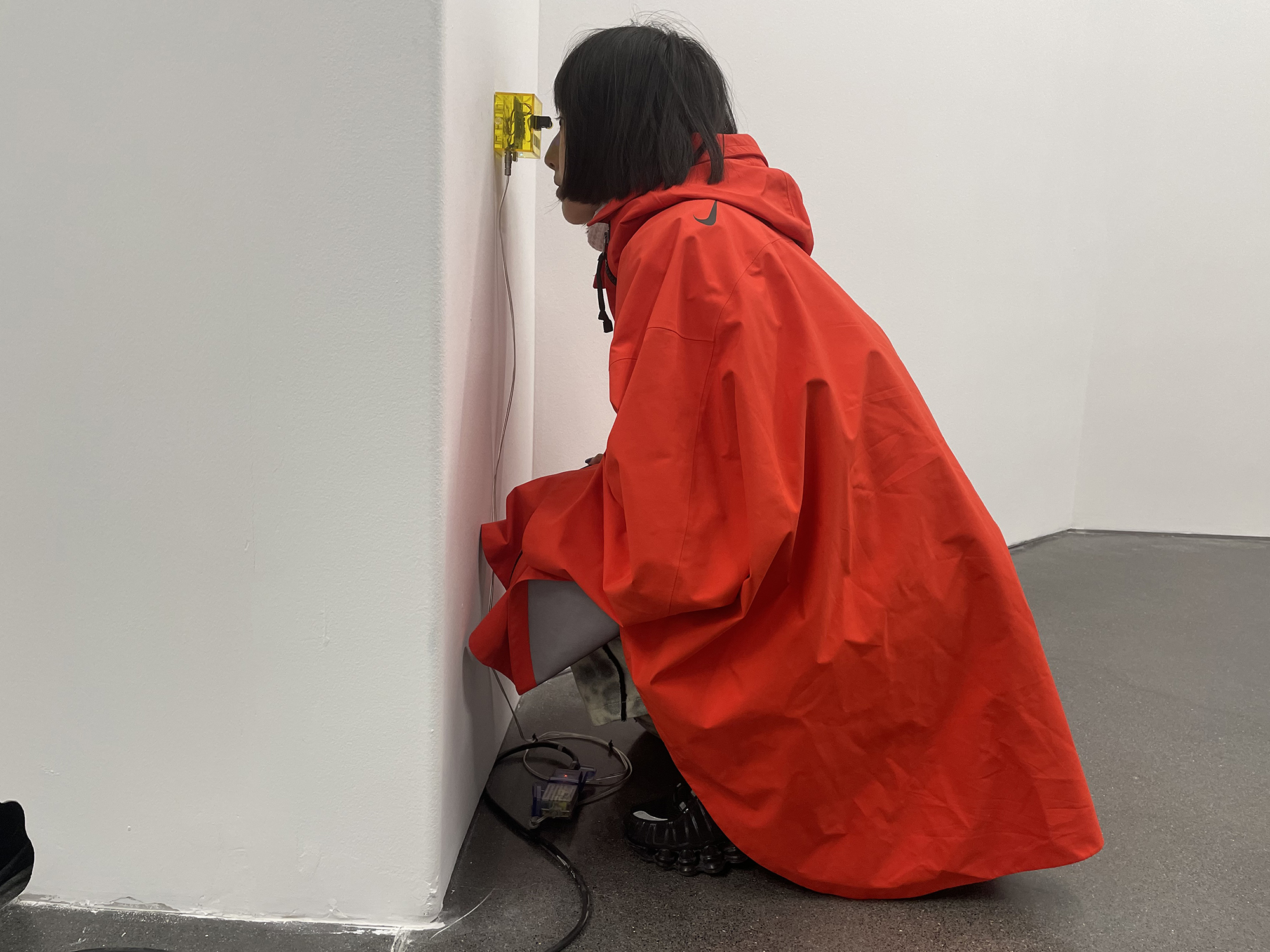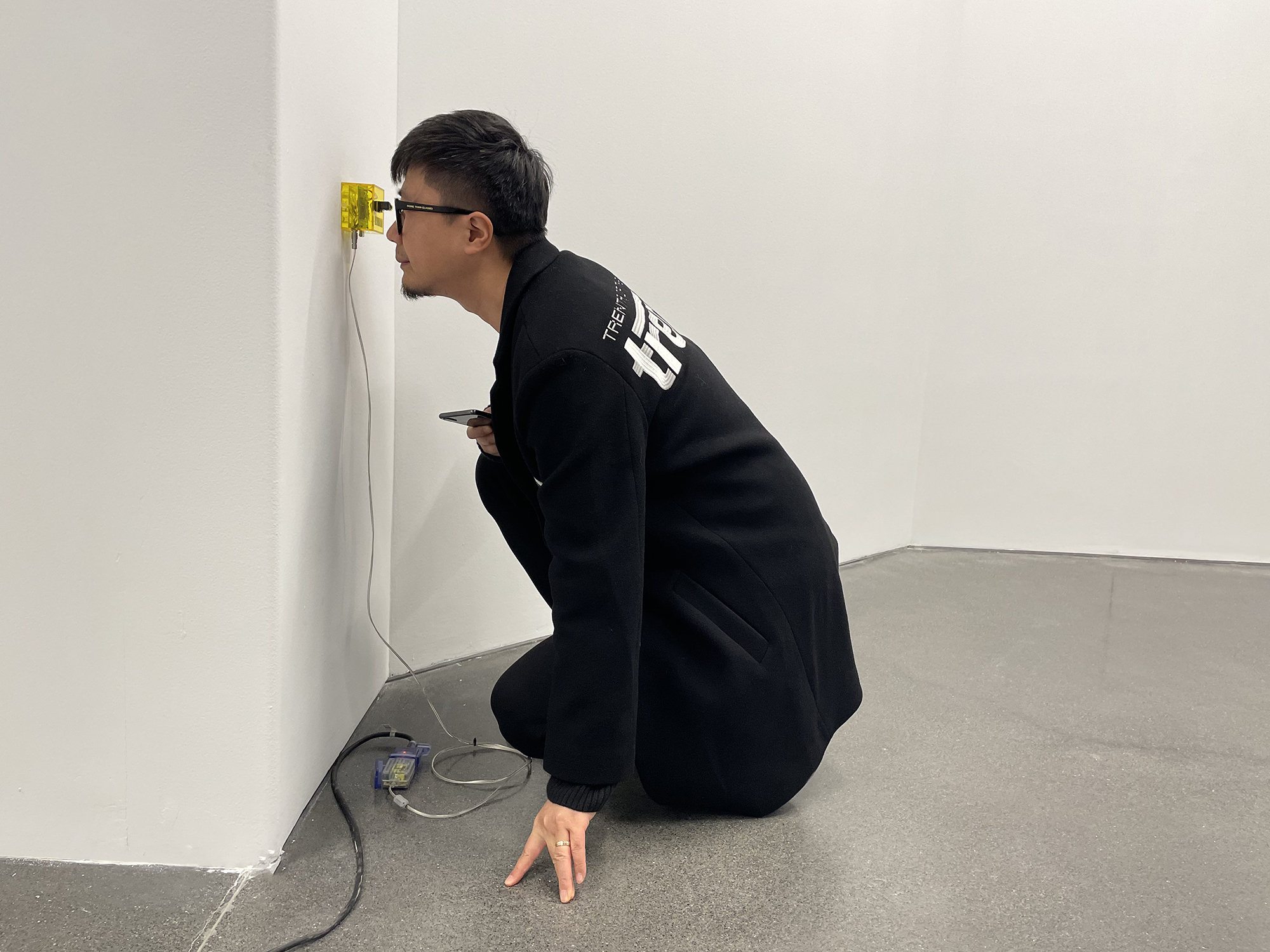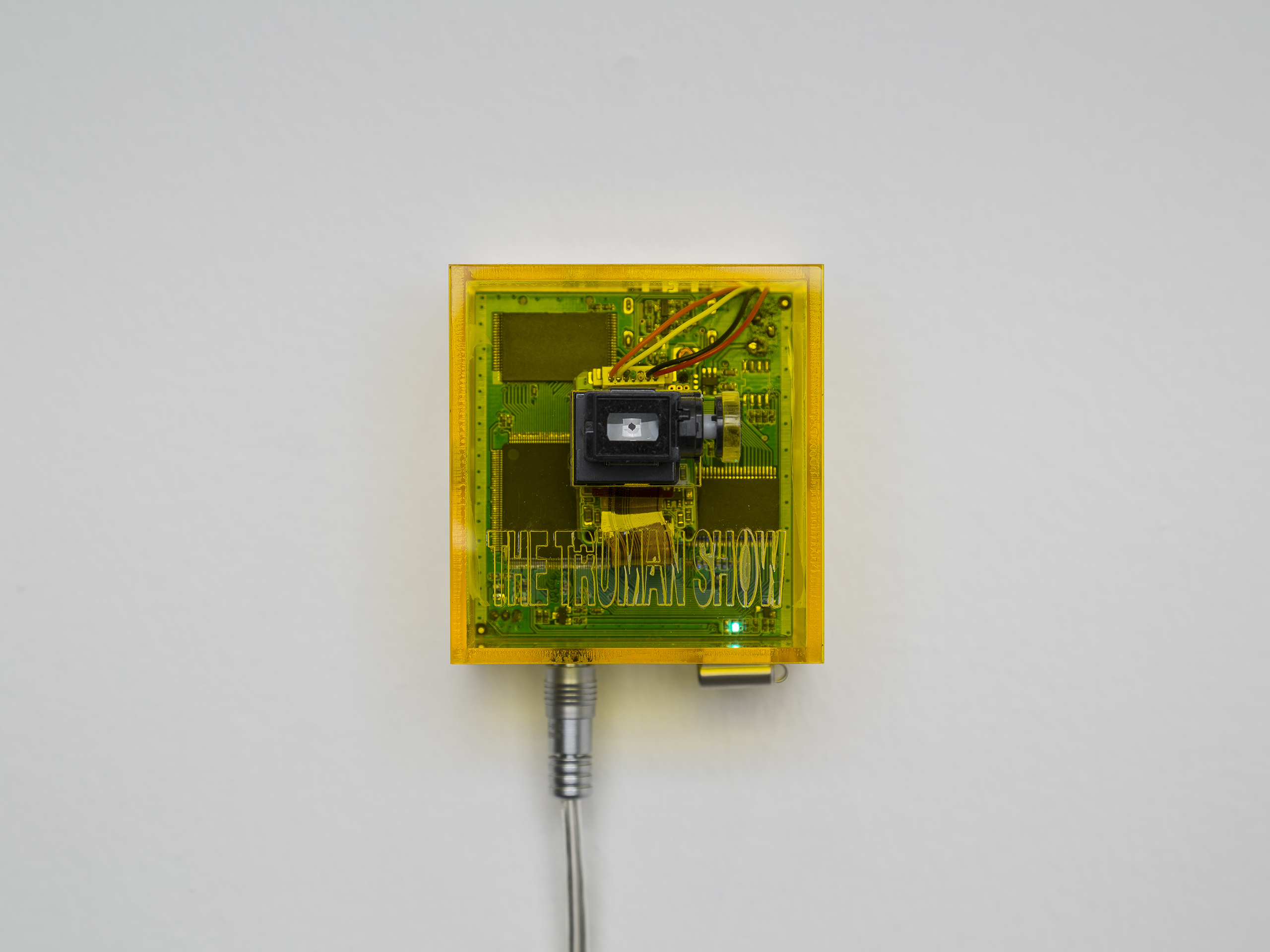 The artist used a one-take long shot to film close-up segments of a model’s full body skin, and presented them through a micro-display equipped with a magnifying lens for viewers to observe voyeuristically. On the transparent yellow acrylic shell appears the inscription “The Truman Show.” In today’s online context, everyone is both a voyeur and the object of voyeurism, while simultaneously being willingly watched within the algorithmic machinery of those in power.