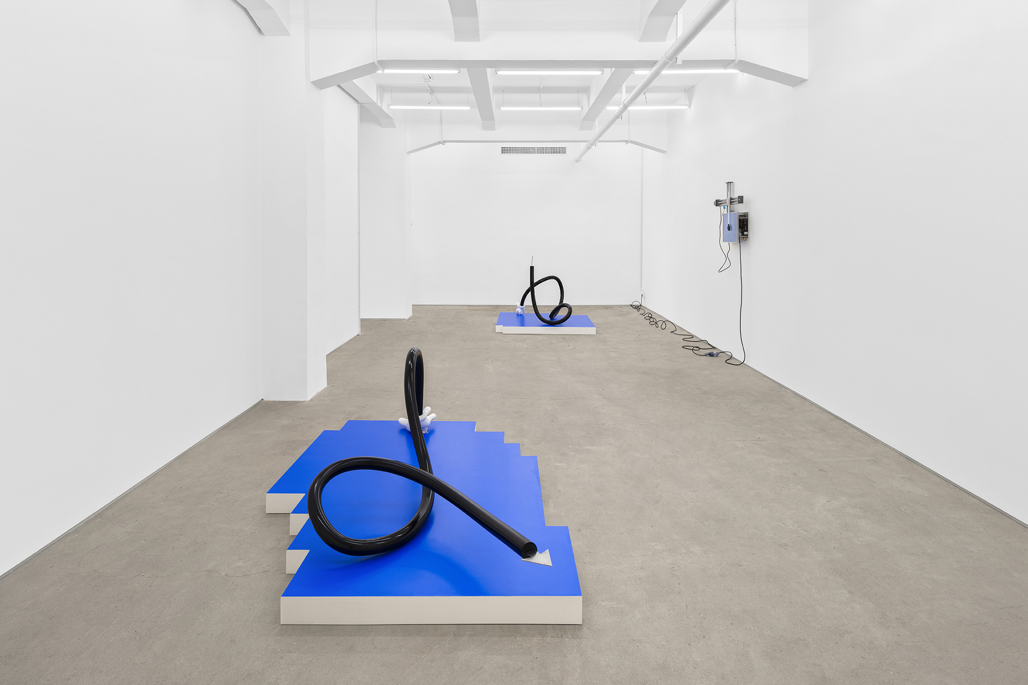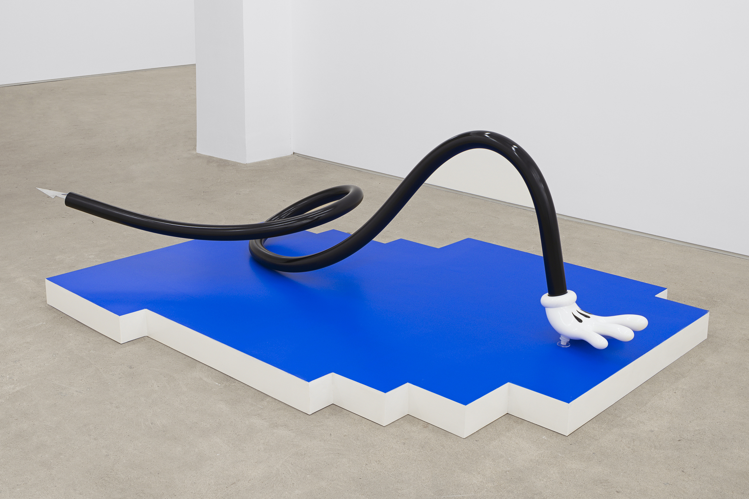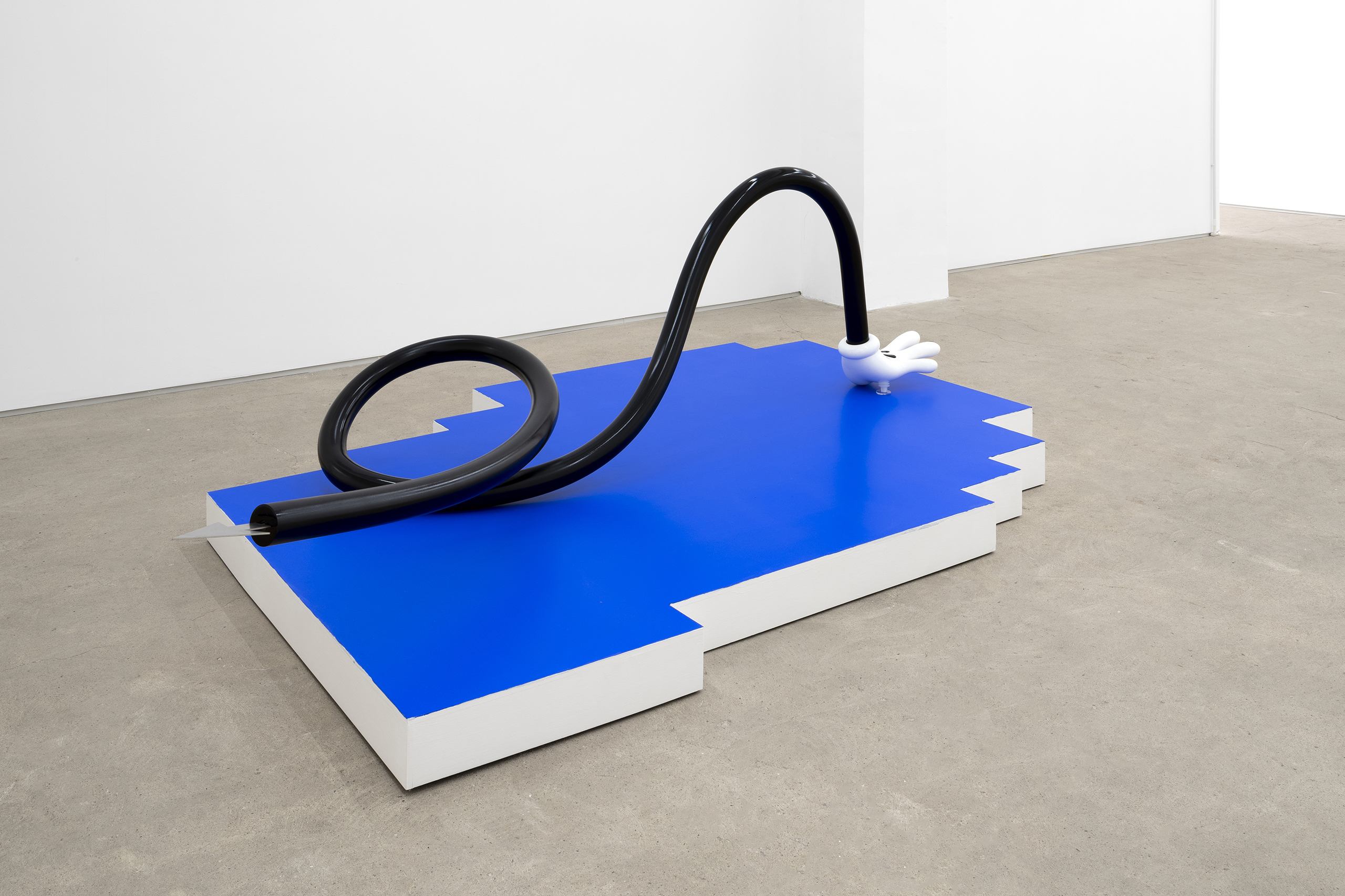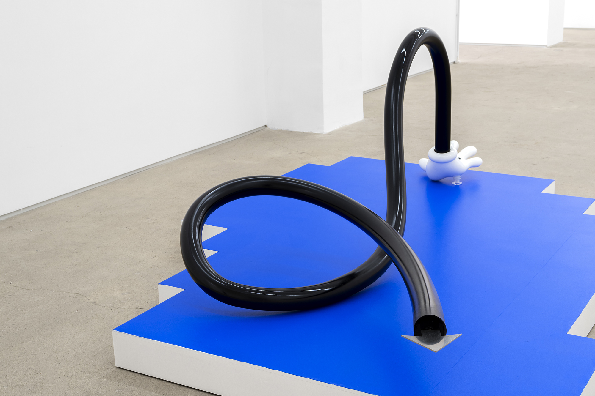 A static sculpture stands atop a pixel-shaped blue screen. One end of the curved black PVC bend is the mouse control gesture under the user’s dimension-reduced avatar, and the other end is a cursor arrow with stainless steel texture. In this sculpture, the cursor arrow does not have the pixel-like sawtooth, but becomes a harmful sharp dagger. The black bend is both the user’s dimension-reduced body (arm) and also the path of the screen operation interface.