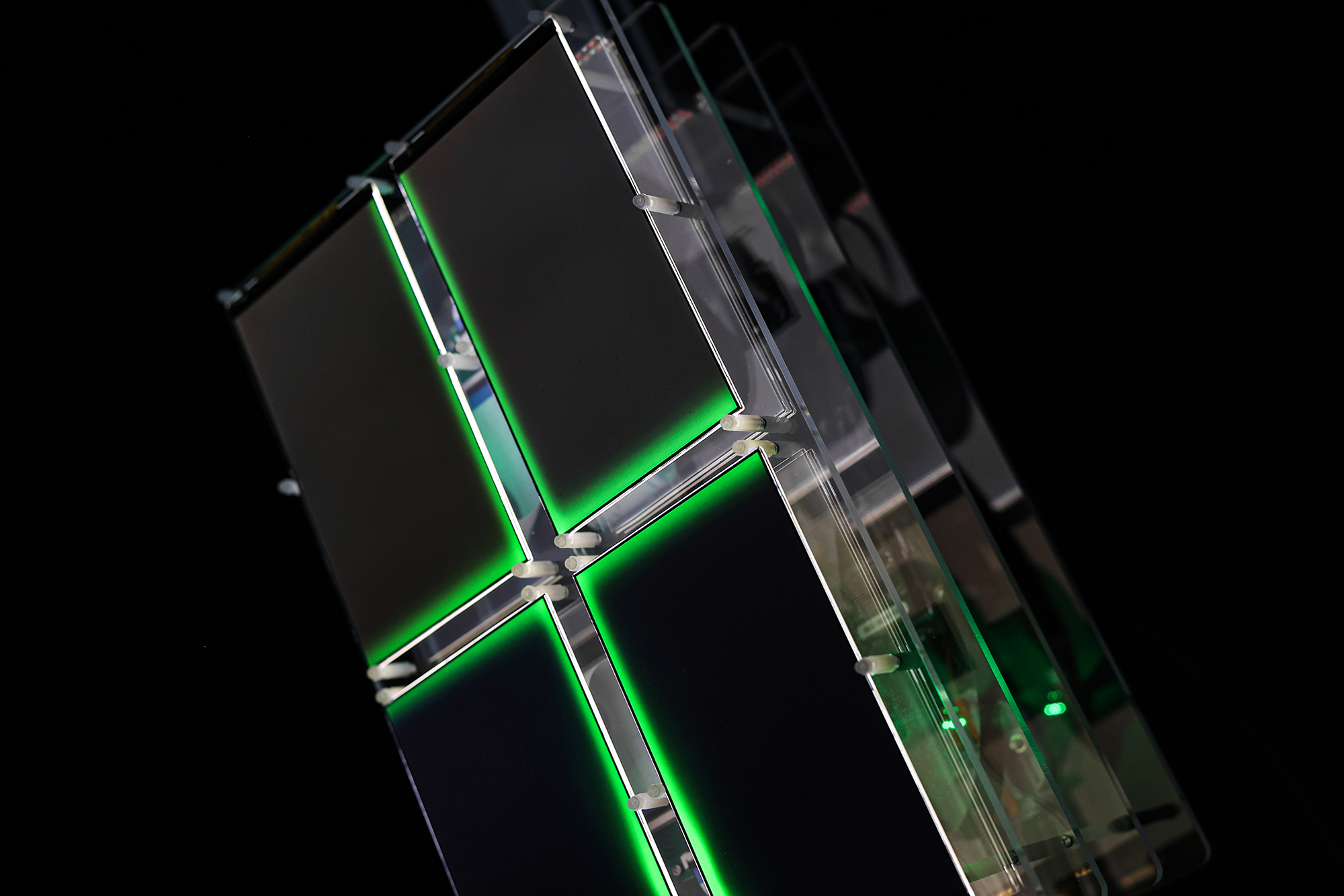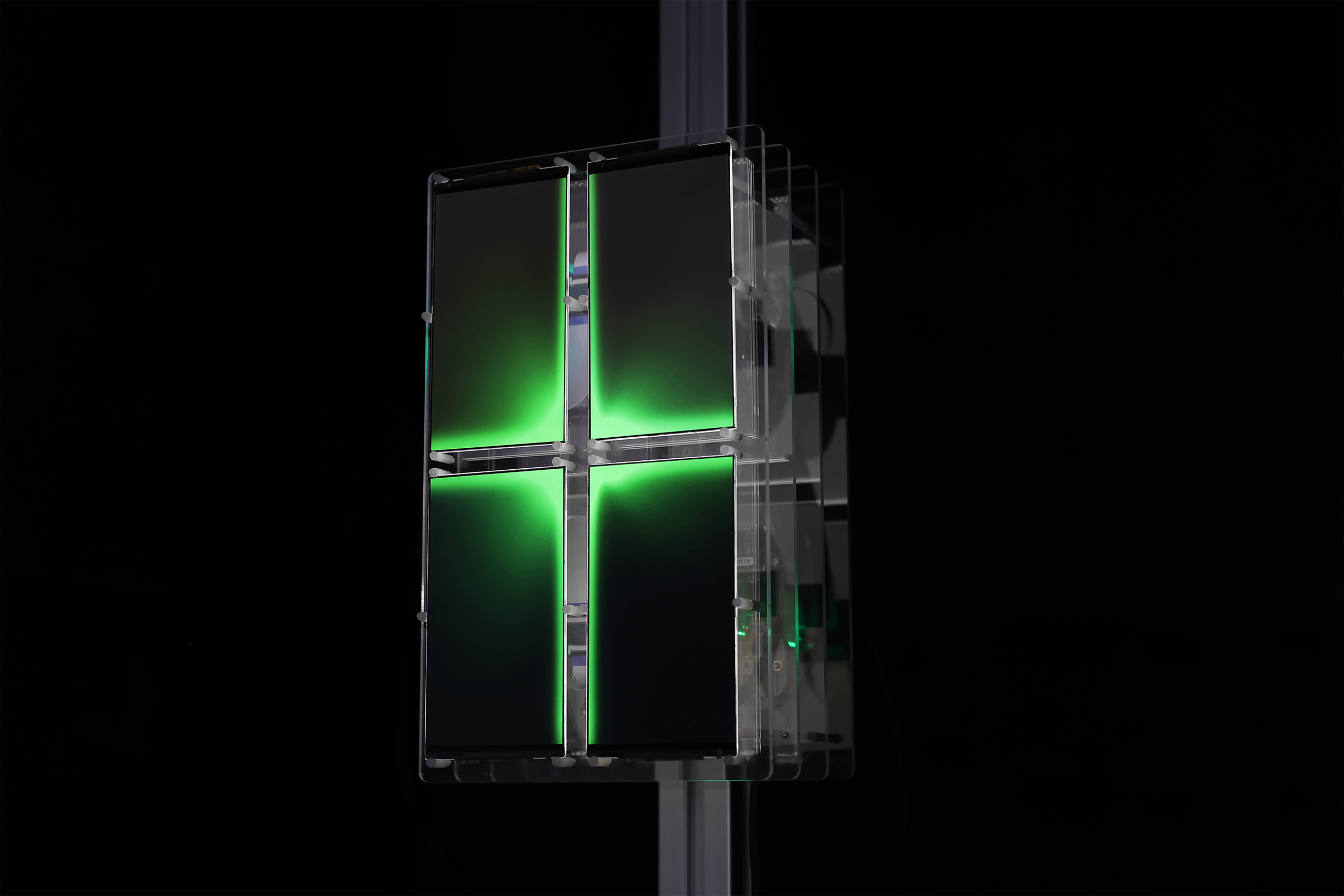 It is a religious symbol made out of the negative form of four interspaced screens, with flowing and bursting supernatural green rays flickering constantly. Screens have now become the fundamental medium that modern people rely heavily on. People’s spiritual life is stored in those separated yet bridged screens.