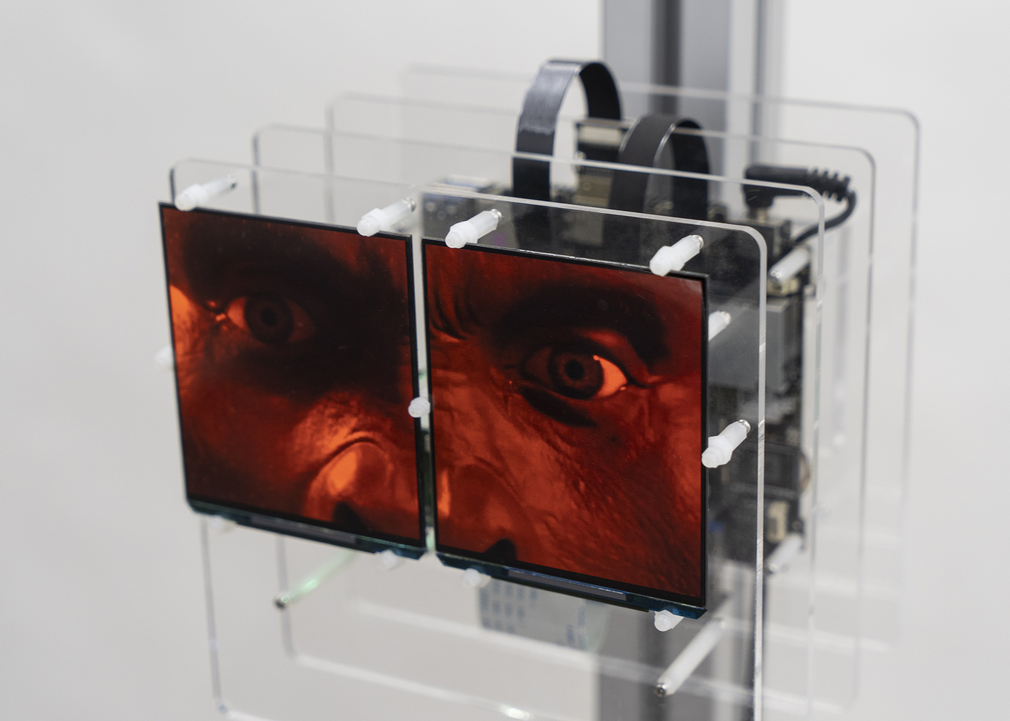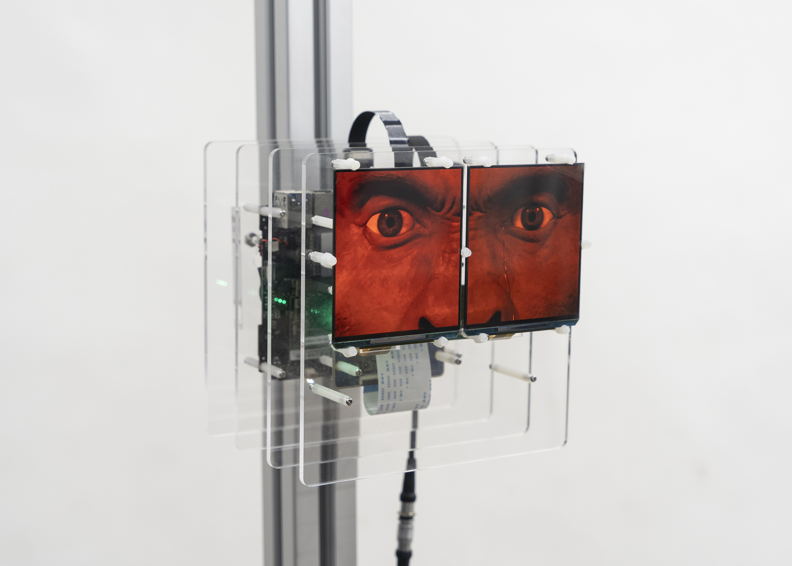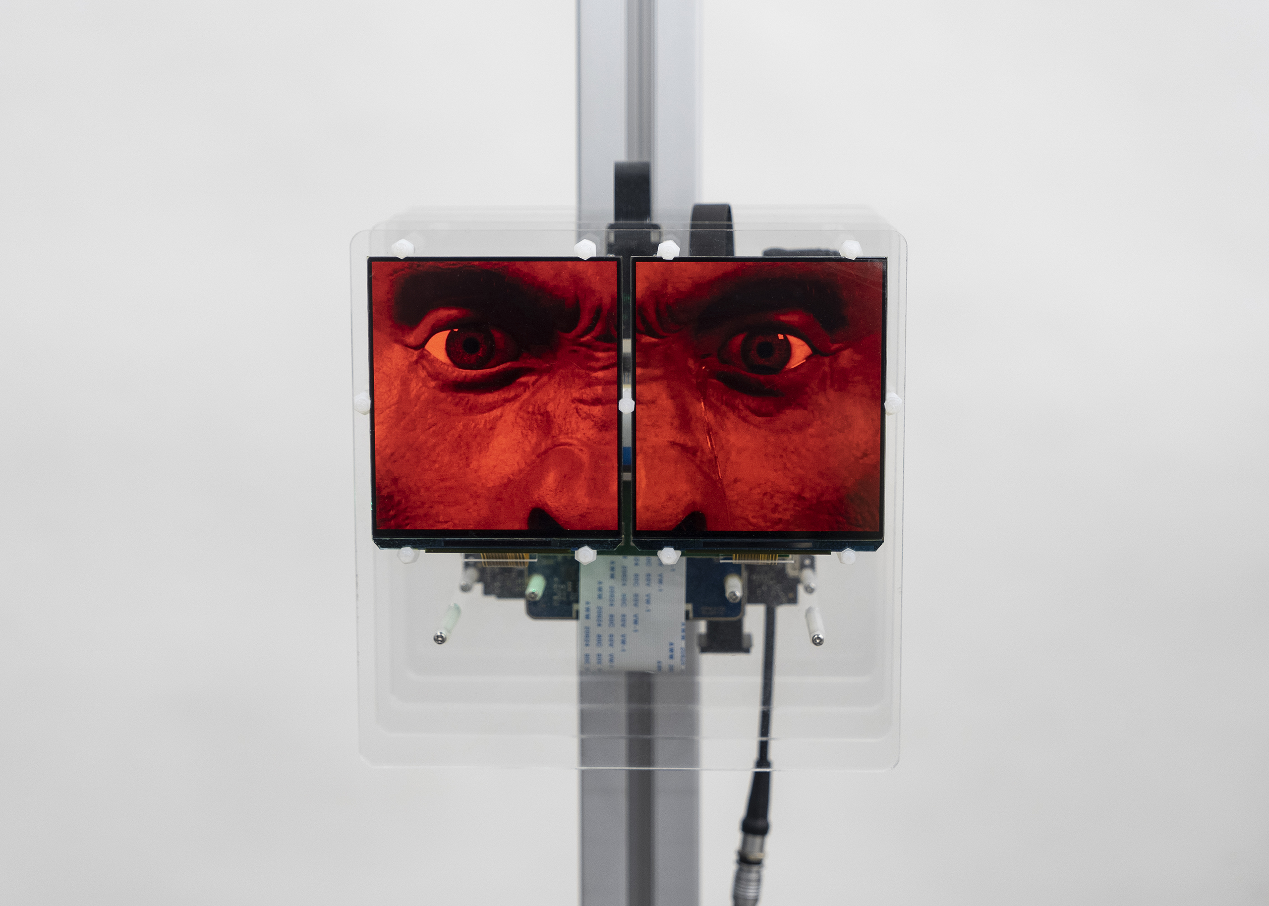 The Borderman series reuses screens from VR headsets and incorporates eye footage either filmed by the artist or produced in 3D animation. The work explores the profound intervention of digital media in individual lived experience, offering a prophetic vision of a Frankensteinian future species. The eyes embedded within the screens command the viewer’s attention and self-awareness, performing the multiplicity of human emotions while exposing the frailty of Artificial Intelligence in its inability to fully emulate human affect and contingency. Submerged in a wash of red light, the eyes evoke the apocalyptic atmosphere of Stanley Kubrick’s 2001: A Space Odyssey (1968), theatrically complicating the ambiguous boundaries between virtuality and reality.