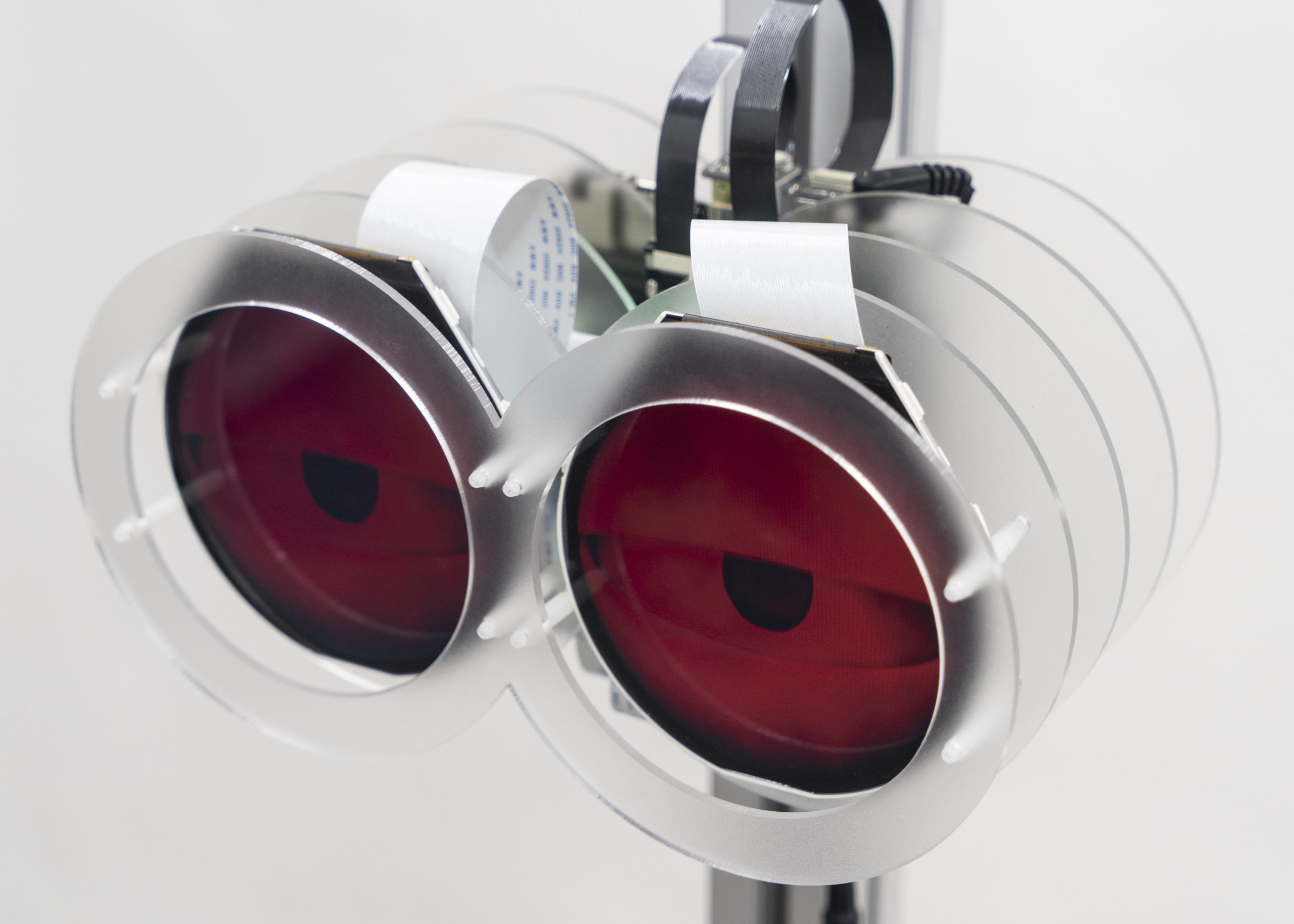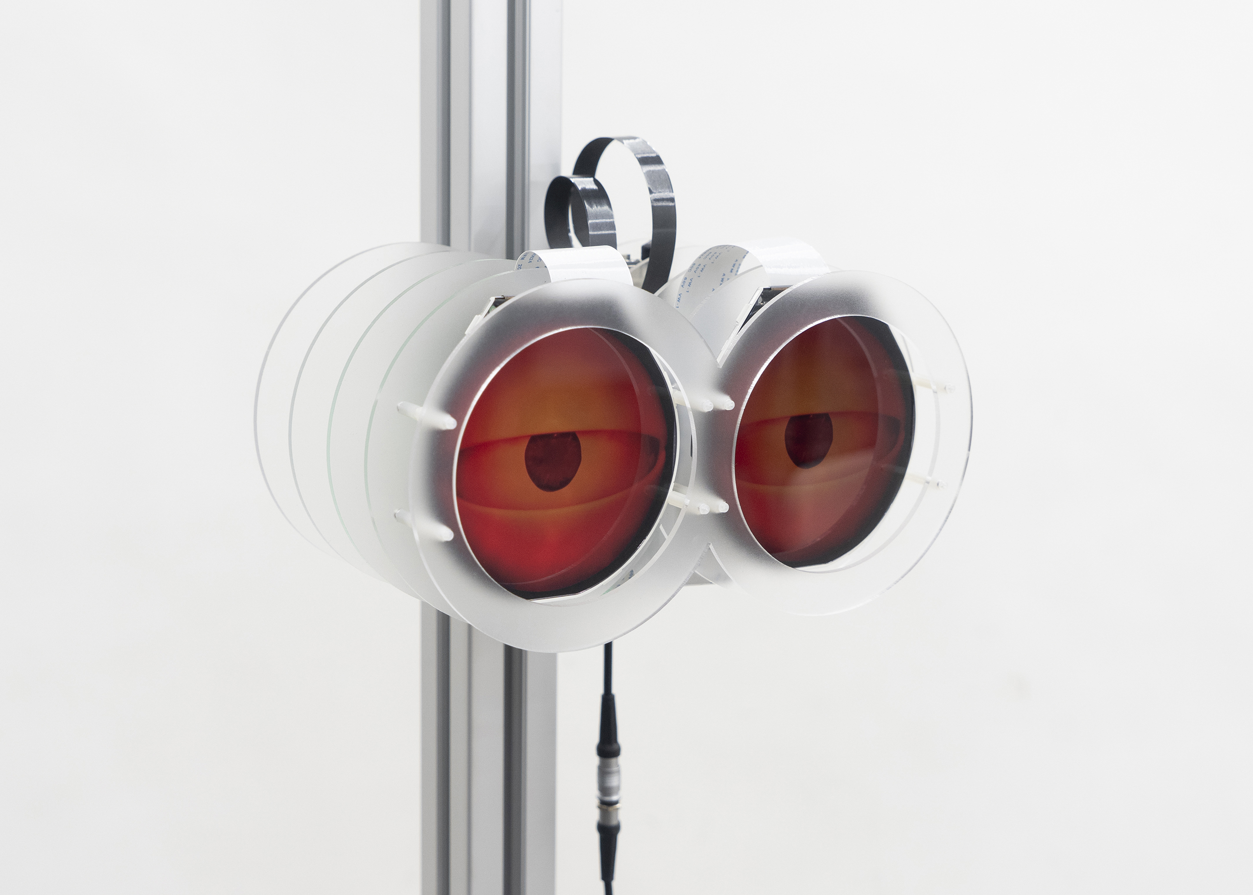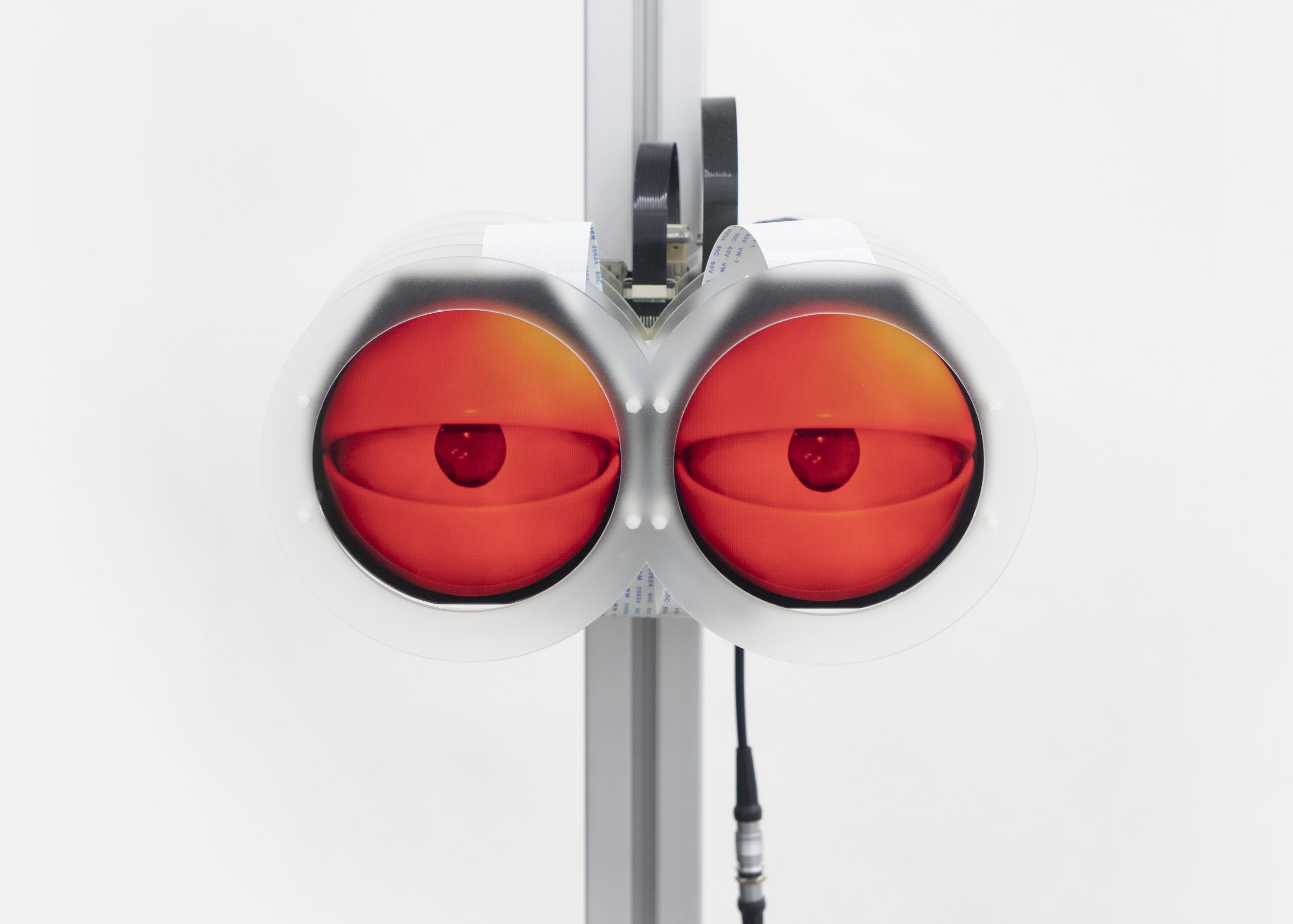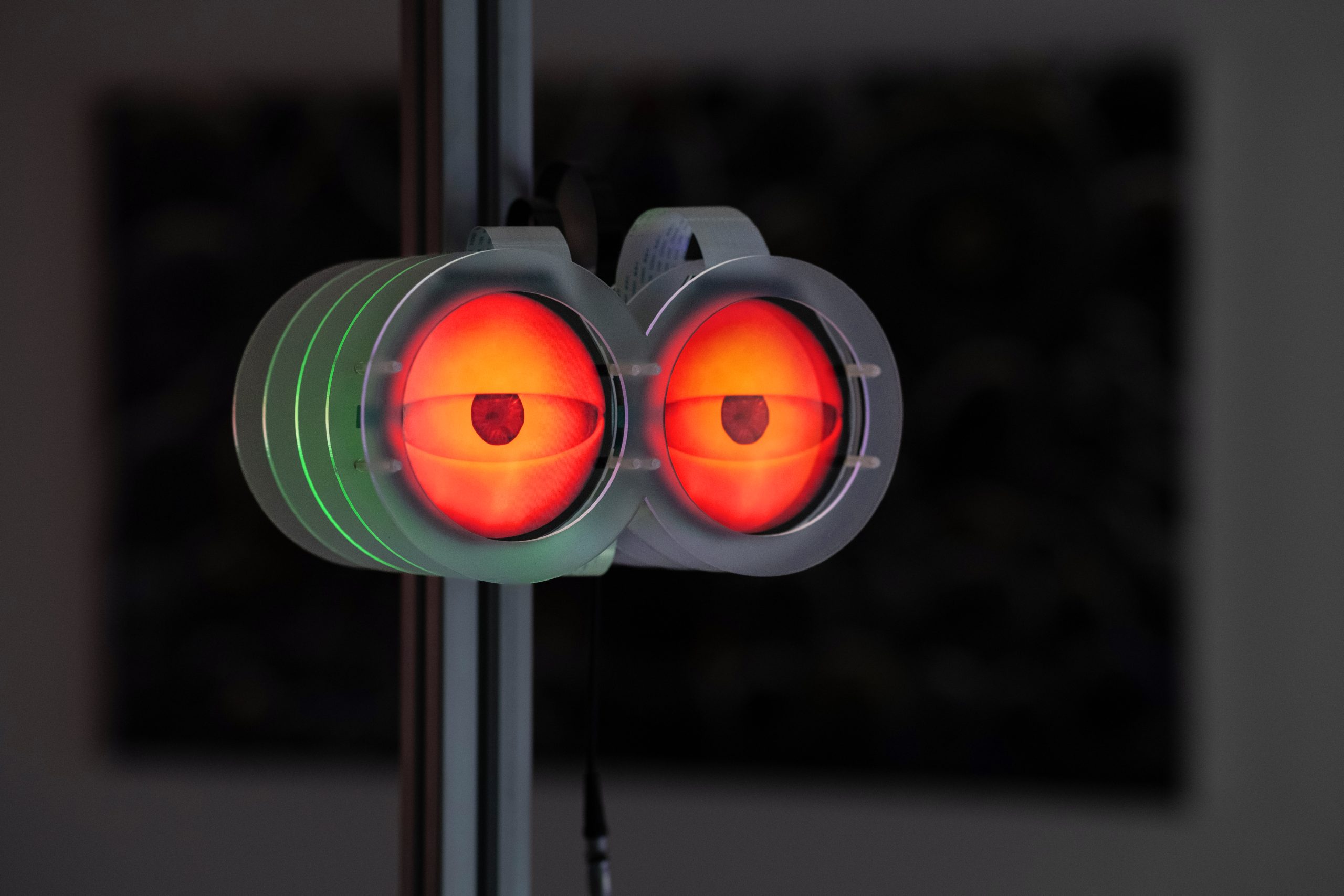 The Borderman series reuses screens from VR headsets and incorporates eye footage either filmed by the artist or produced in 3D animation. The work explores the profound intervention of digital media in individual lived experience, offering a prophetic vision of a Frankensteinian future species. The eyes embedded within the screens command the viewer’s attention and self-awareness, performing the multiplicity of human emotions while exposing the frailty of Artificial Intelligence in its inability to fully emulate human affect and contingency. Submerged in a wash of red light, the eyes evoke the apocalyptic atmosphere of Stanley Kubrick’s 2001: A Space Odyssey (1968), theatrically complicating the ambiguous boundaries between virtuality and reality.