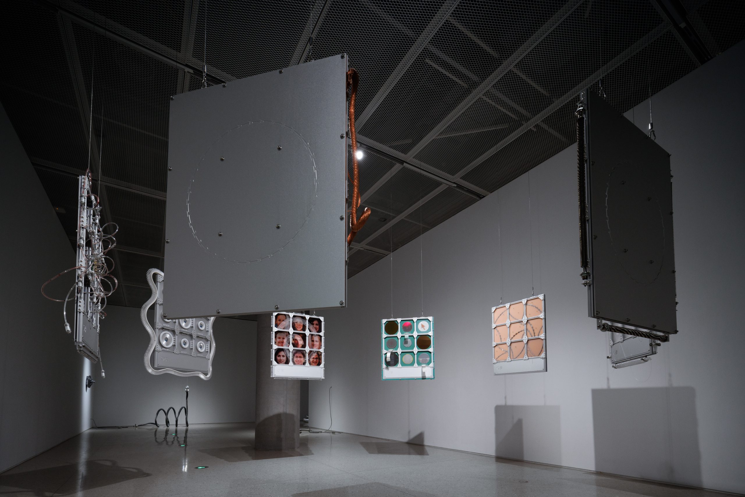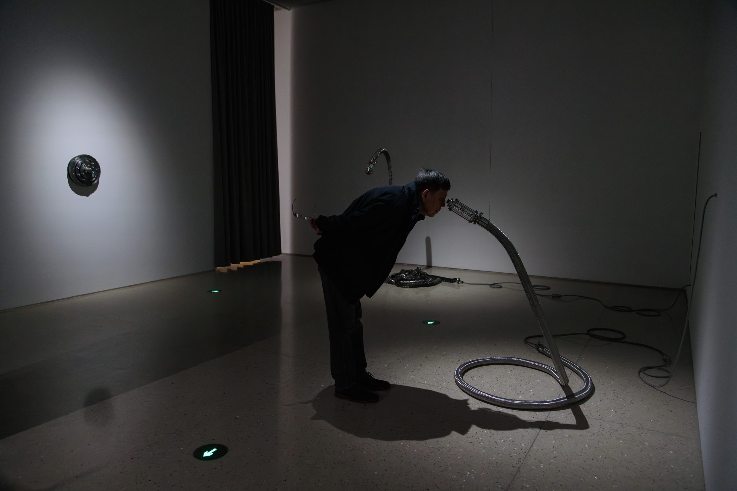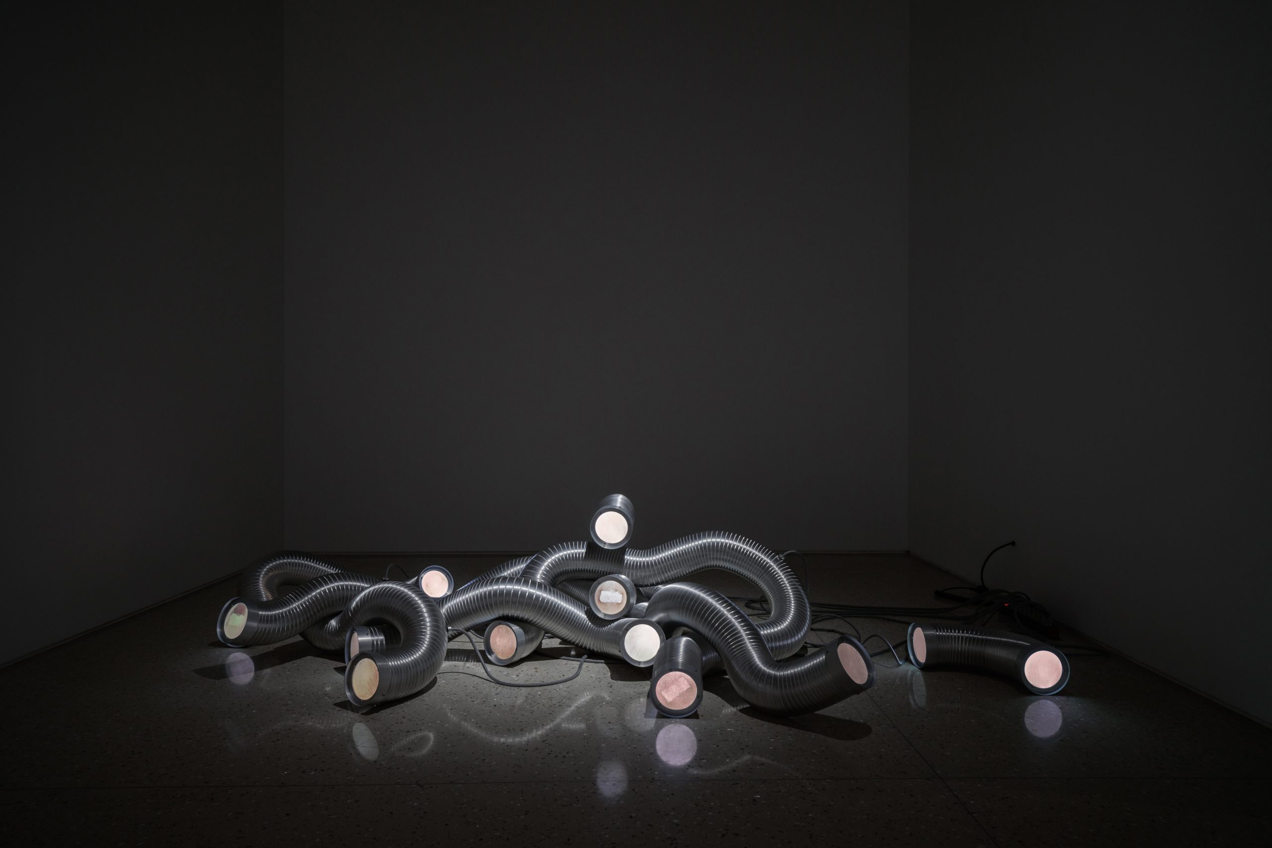Media is no longer a cold neutral conduit. It has become a bio-interface combined with temperature, memory, and reactivity. Corrugated tubes transfer energy and signals as worms; micro-screens secrete language and imagery like glands; rotating bearings chew through substances and flesh as mechanical mouths. A ghostly thermoregulation system rises in the exhibition, destabilizing the viewers with acts of approach disorientation, and bodily misalignment—until one seemingly enters a non-human shell: a strange and vibrant media-organism.