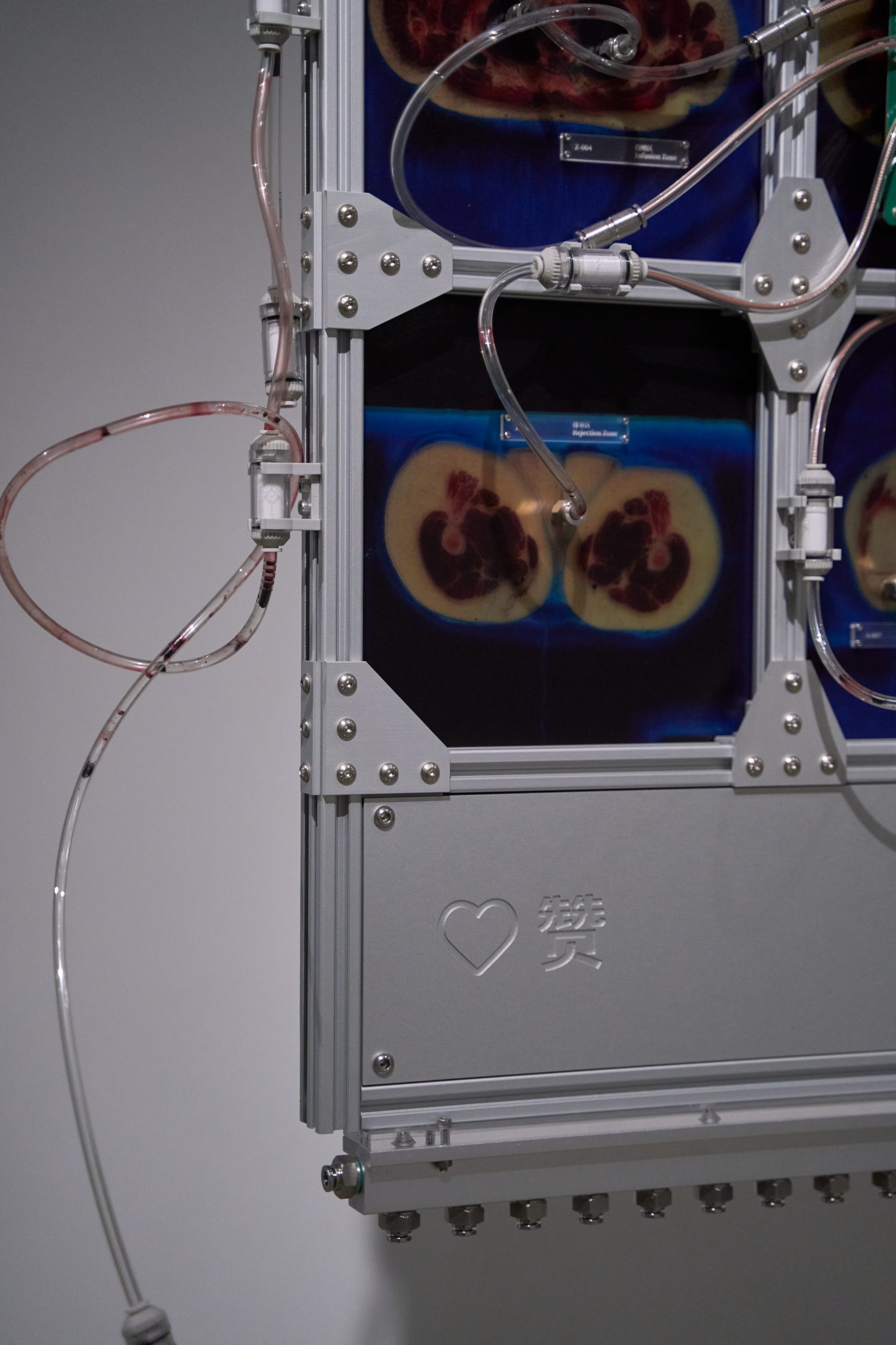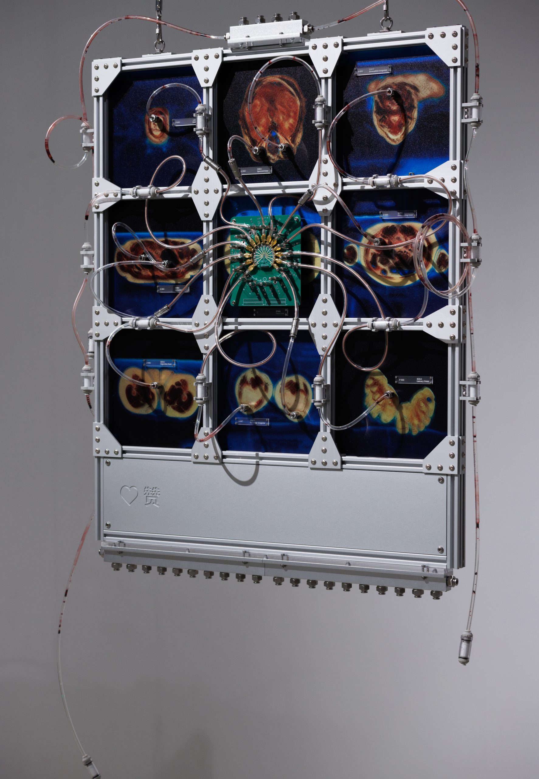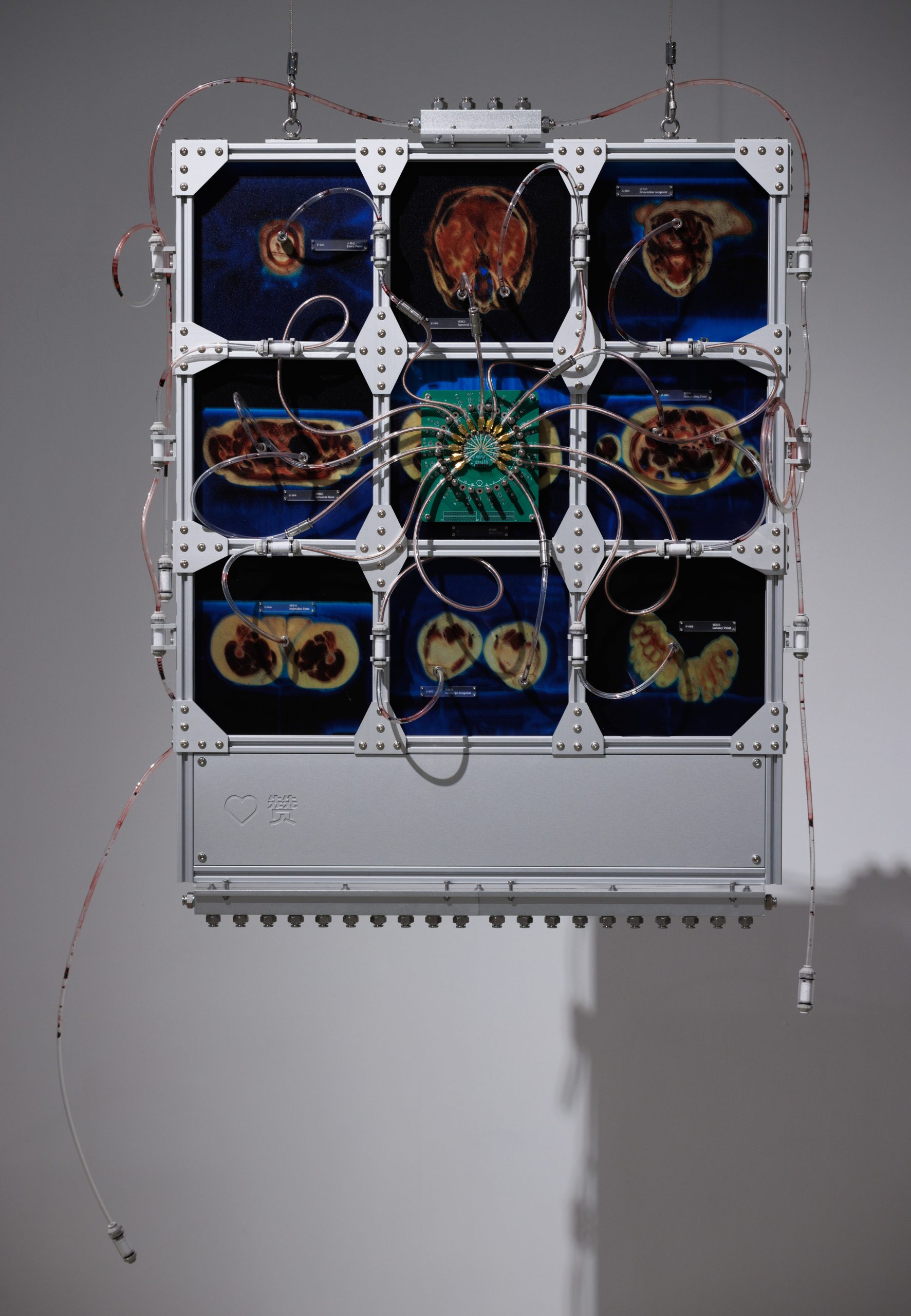 Circular Interface: Anatomy takes the medical imagery of The Visible Human Project as its visual source, extracting nine horizontal cross-sections of the human body—from head to toe—and arranging them sequentially within a nine-grid structure, each printed onto frosted acrylic panels. The work reorganizes and renames these anatomical images through the visual logic of traditional Chinese acupuncture diagrams, turning the body into a medium simultaneously dissected by science and reconstructed by symbols. From key points in each image, a transparent PU tube filled with simulated blood extends outward, all converging at the central fifth grid—the Eden Core. This central image is derived from the anatomical cross-section of the human reproductive region, over which a network of fine-wire probes and an RF development board is mounted, forming a core organ that fuses technological circuitry with biological metaphor. The PU tubes radiate from the central RF transmission interface, as if blood and signal flow within the same circulatory system. By invoking anatomy, the work refers not only to the precision dissection of the modern body by technology, but also to the redistribution of perception and desire in a mediated society. Here, the body is no longer a biological entity but a readable, conductive, and regenerative interface map.