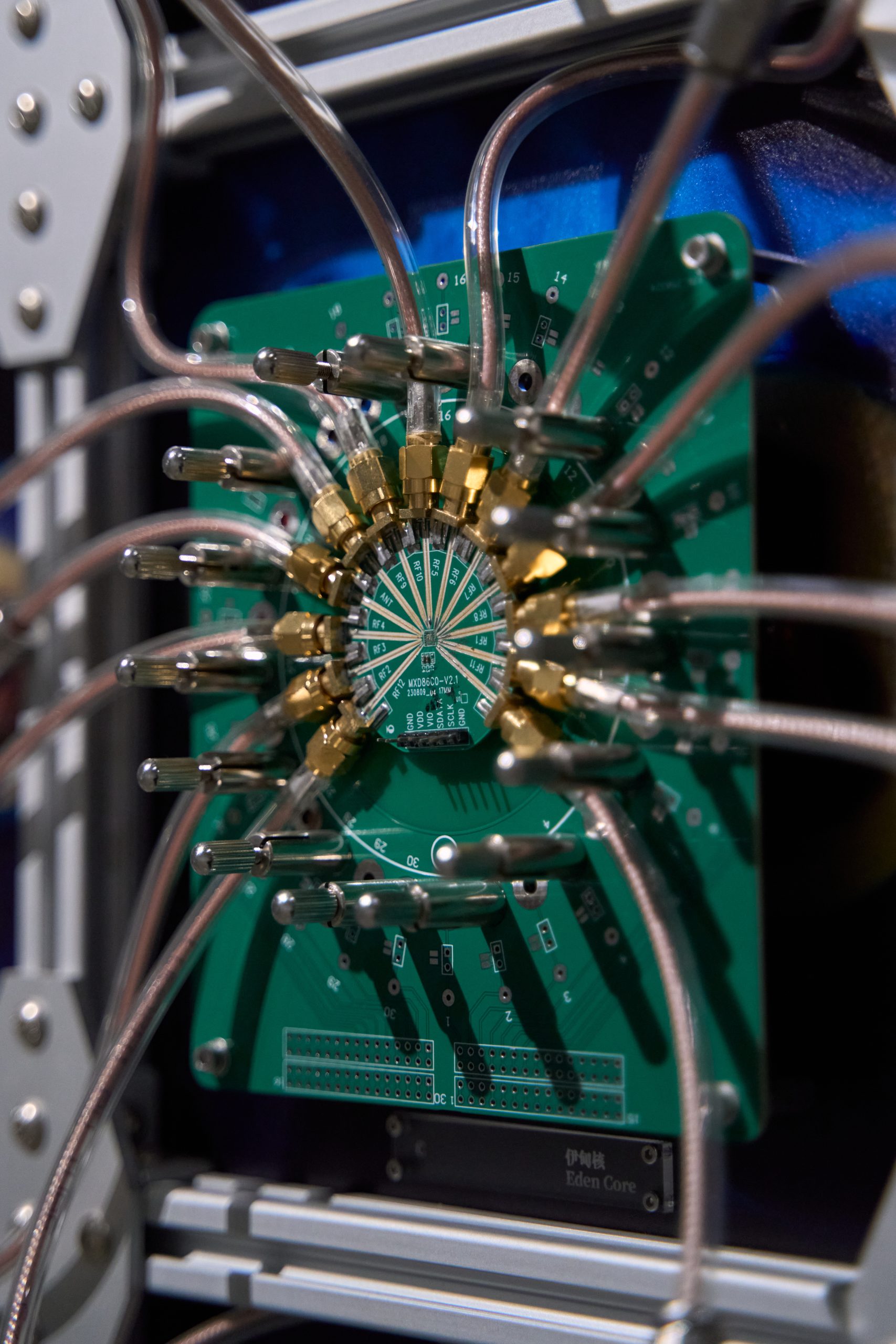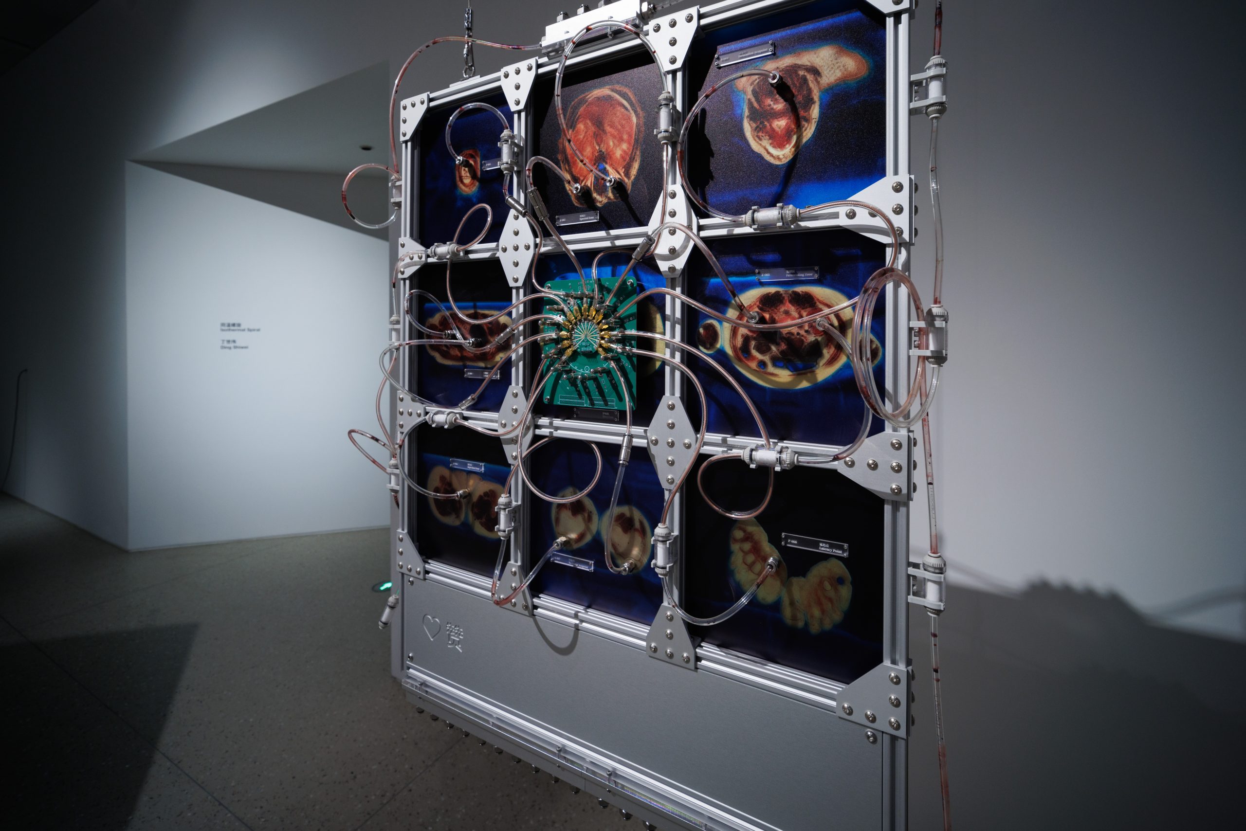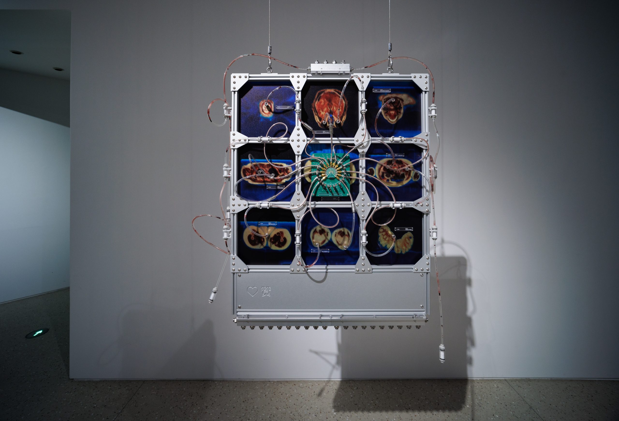 Circular Interface: Anatomy takes the medical imagery of The Visible Human Project as its visual source, extracting nine horizontal cross-sections of the human body—from head to toe—and arranging them sequentially within a nine-grid structure, each printed onto frosted acrylic panels. The work reorganizes and renames these anatomical images through the visual logic of traditional Chinese acupuncture diagrams, turning the body into a medium simultaneously dissected by science and reconstructed by symbols. From key points in each image, a transparent PU tube filled with simulated blood extends outward, all converging at the central fifth grid—the Eden Core. This central image is derived from the anatomical cross-section of the human reproductive region, over which a network of fine-wire probes and an RF development board is mounted, forming a core organ that fuses technological circuitry with biological metaphor. The PU tubes radiate from the central RF transmission interface, as if blood and signal flow within the same circulatory system. By invoking anatomy, the work refers not only to the precision dissection of the modern body by technology, but also to the redistribution of perception and desire in a mediated society. Here, the body is no longer a biological entity but a readable, conductive, and regenerative interface map.
