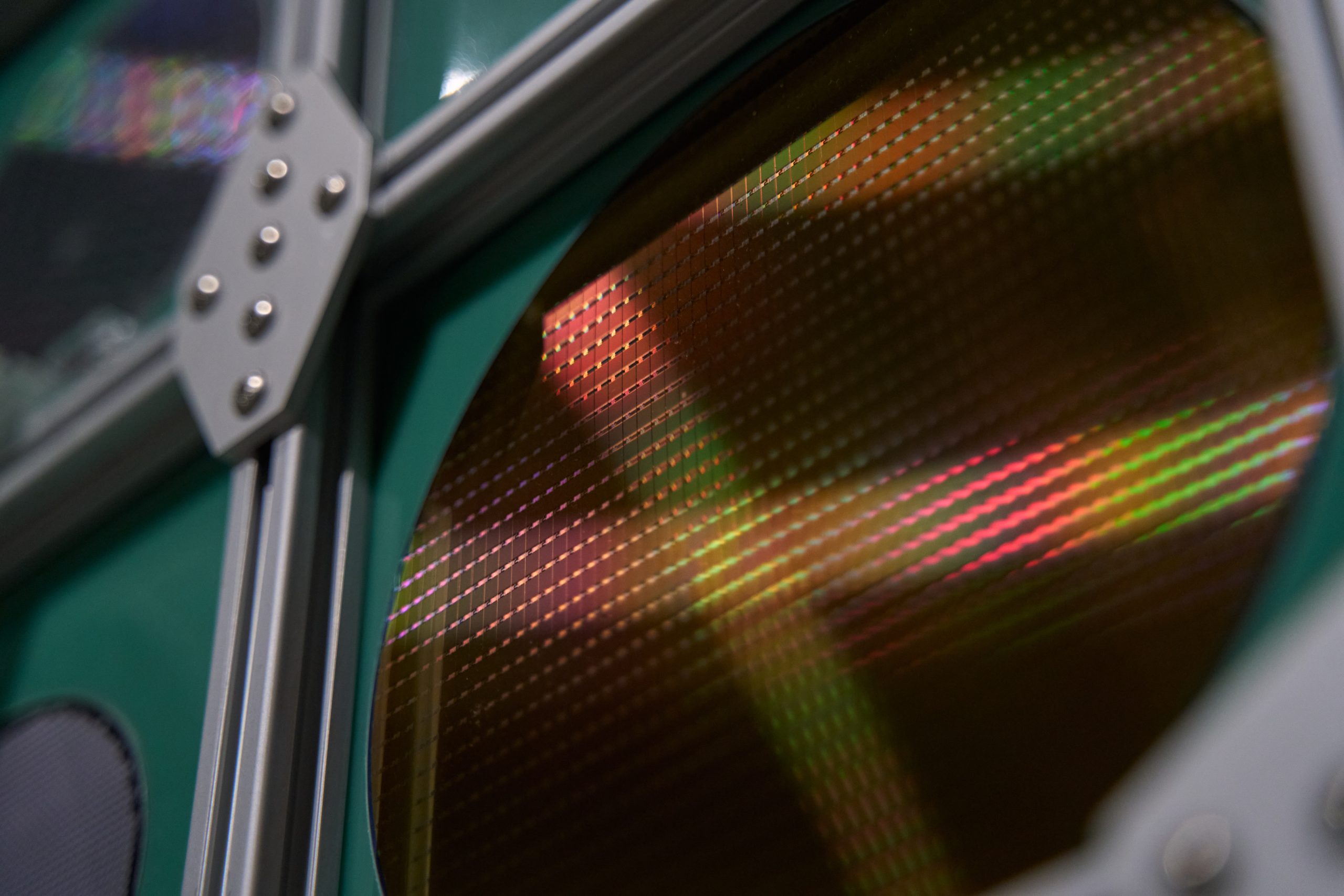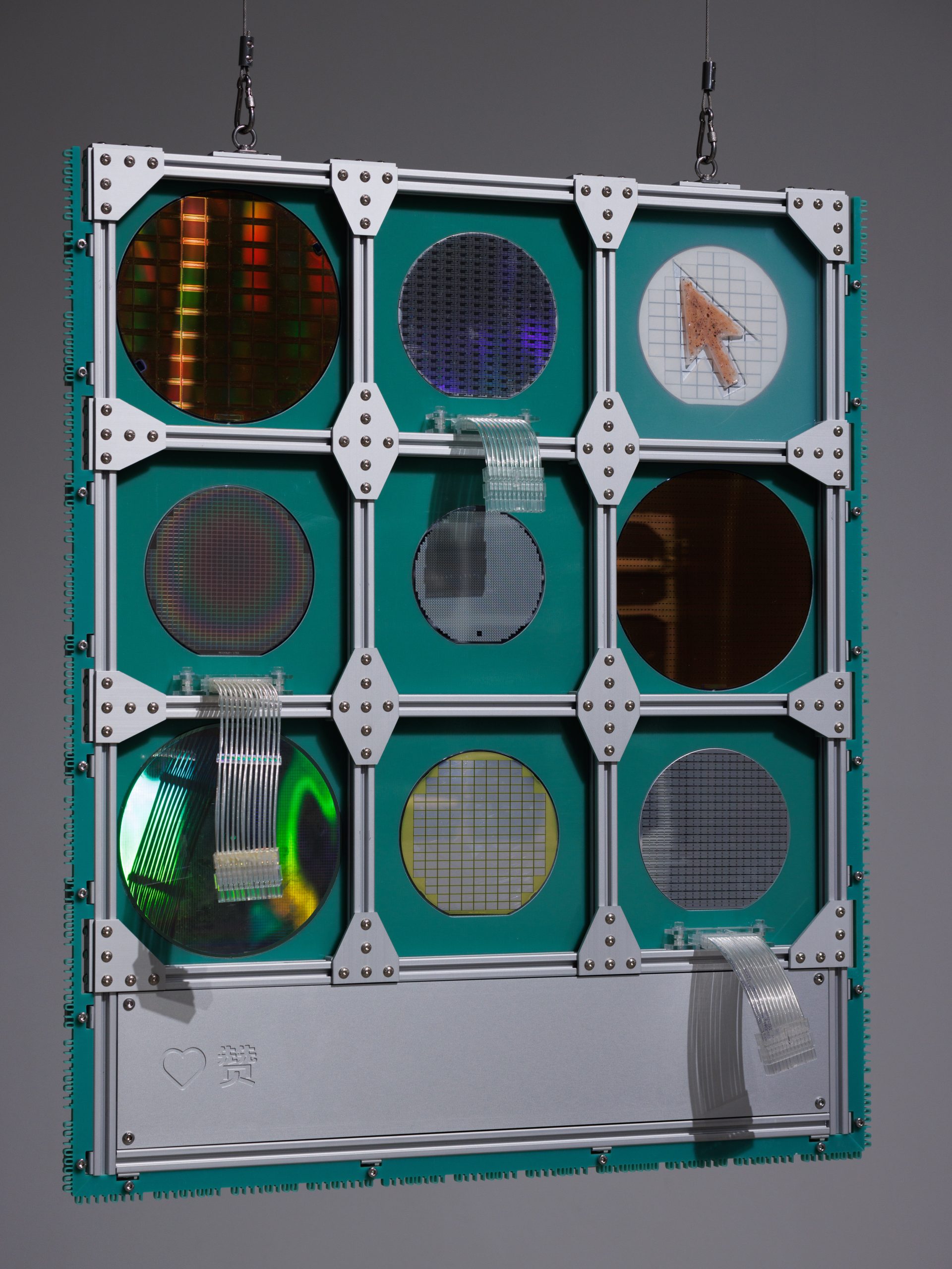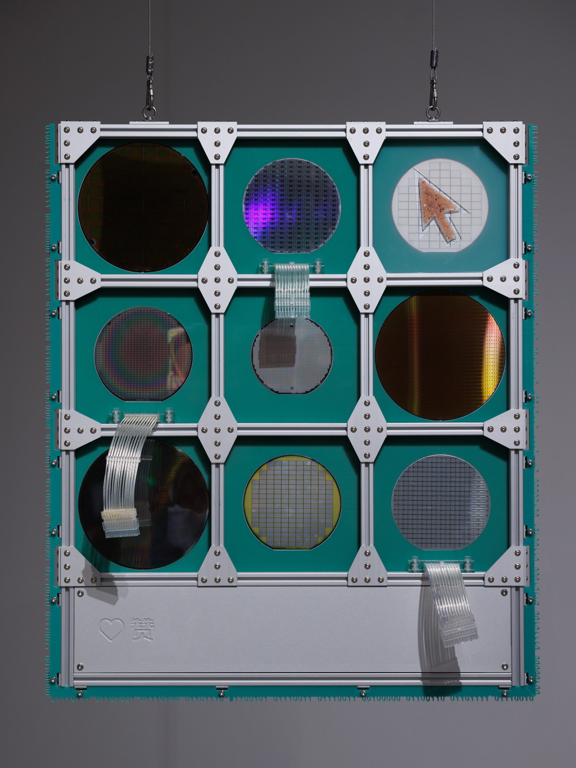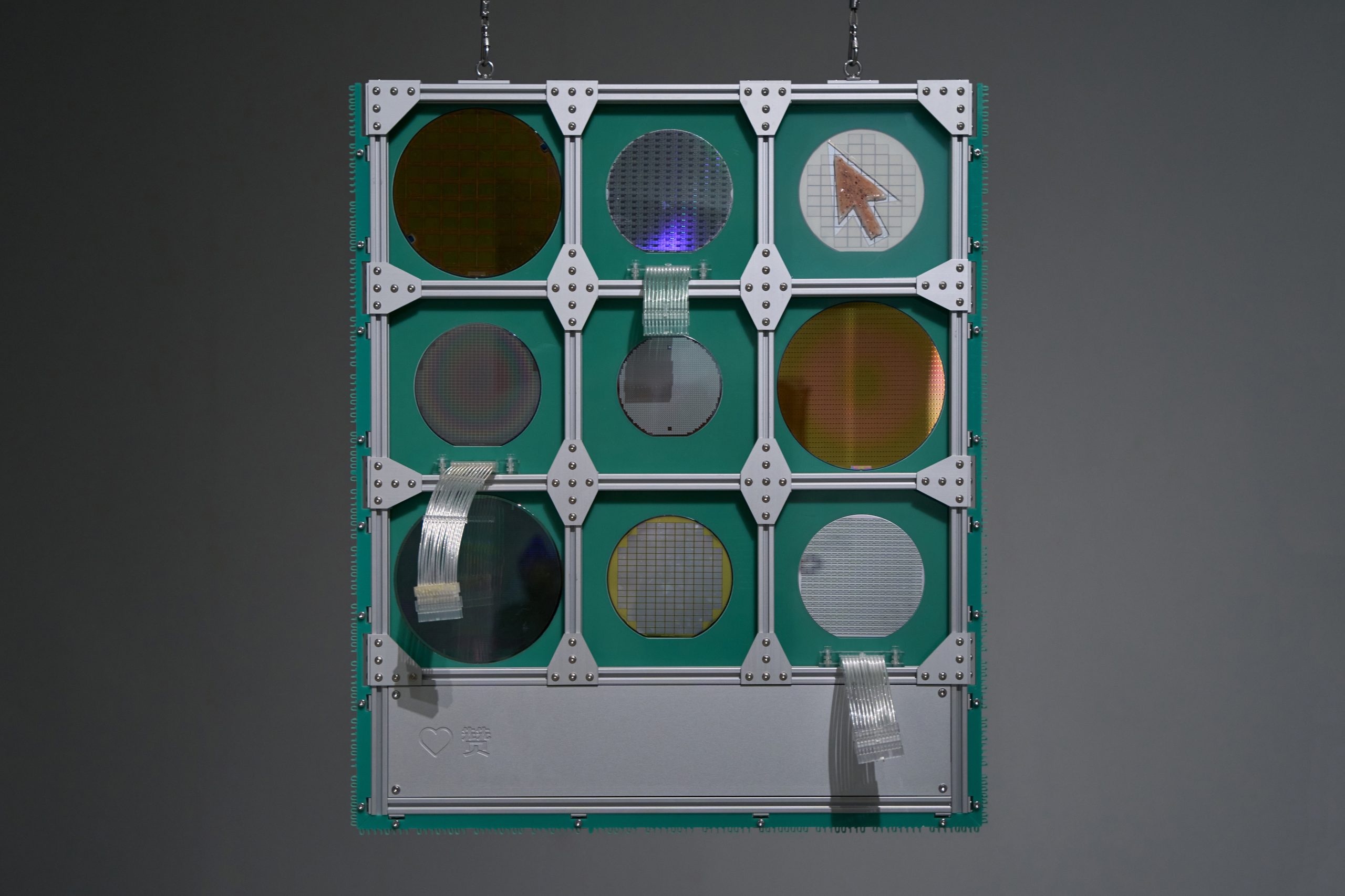 Circular Interface: System presents a deconstruction of the technological infrastructure underlying contemporary social media and artificial intelligence. Beginning with the smallest electronic component, the work dissects the complexity of information technology in reverse: the chip is restored to its silicon wafer, the circuit board to its pale green fiberglass substrate, and the data connection to a 24-pin cable. In this reversal, the material foundations once hidden beneath layers of algorithms and enclosures are revealed again, turning the invisible into a visible structure. Along the aluminum frame, Paul Celan’s verse — No one bears witness for the witness. — is engraved and translated into binary code. Here, poetry becomes data; language is converted into the syntax of the machine, and the act of witnessing collapses into repetition and erasure. The work exposes a paradox: when all meaning is digitized and encoded, the system itself becomes the only witness that remains.