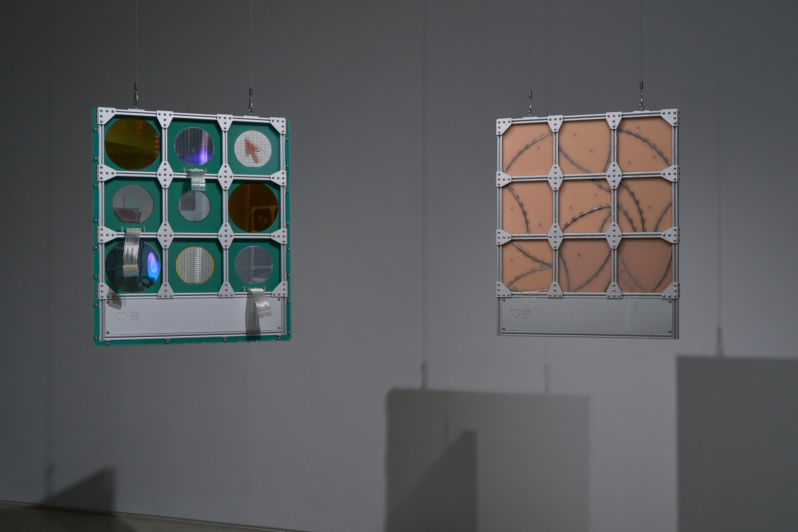 Circular Interface consists of eight custom-built structural units. Each unit is assembled from aluminum profiles and CNC-milled aluminum panels forming a nine-grid framework. The front surface of each panel is precisely engraved with the Chinese character for Like (赞), echoing the ubiquitous Like button across social media. The nine grids are joined by multi-screw aluminum connectors, maintaining a strict and modular geometry — the structure resembles both a standardized social-media interface and the barred window of a cell. On the reverse side, a milled circular barbed-wire pattern serves as a visual emblem, hinting at the hidden mechanisms of control behind the interface. Beneath the seemingly gentle surface of social imagery lies a field of surveillance, discipline, and partitioned vision. Together, the eight units form a closed loop — a structural model of algorithmic circulation — enclosing the viewer within the space of the interface itself.