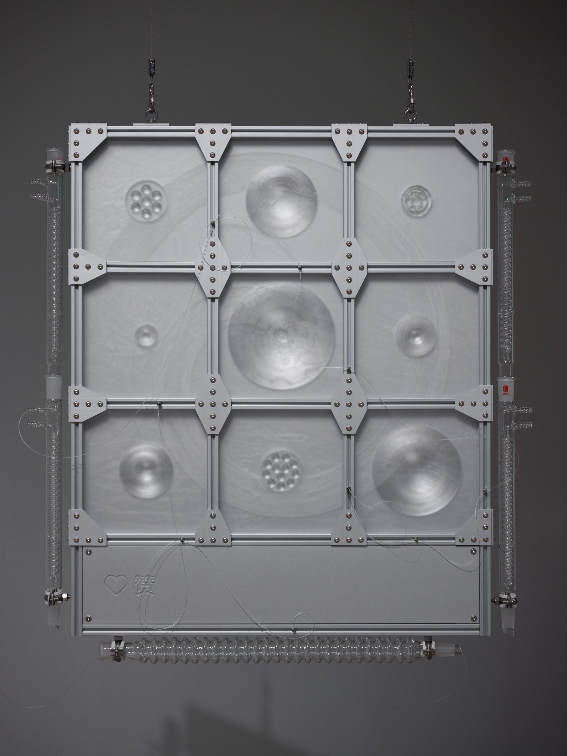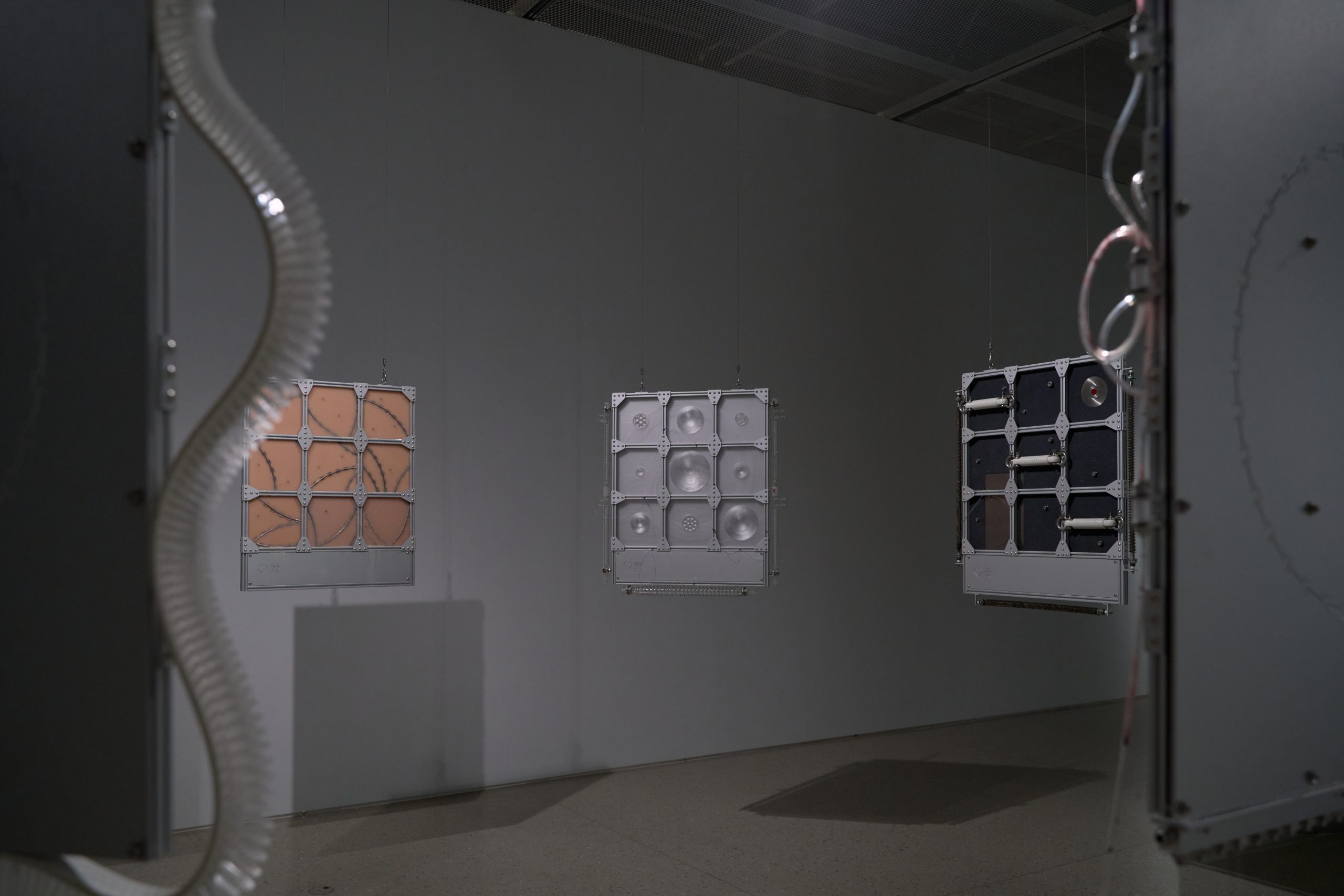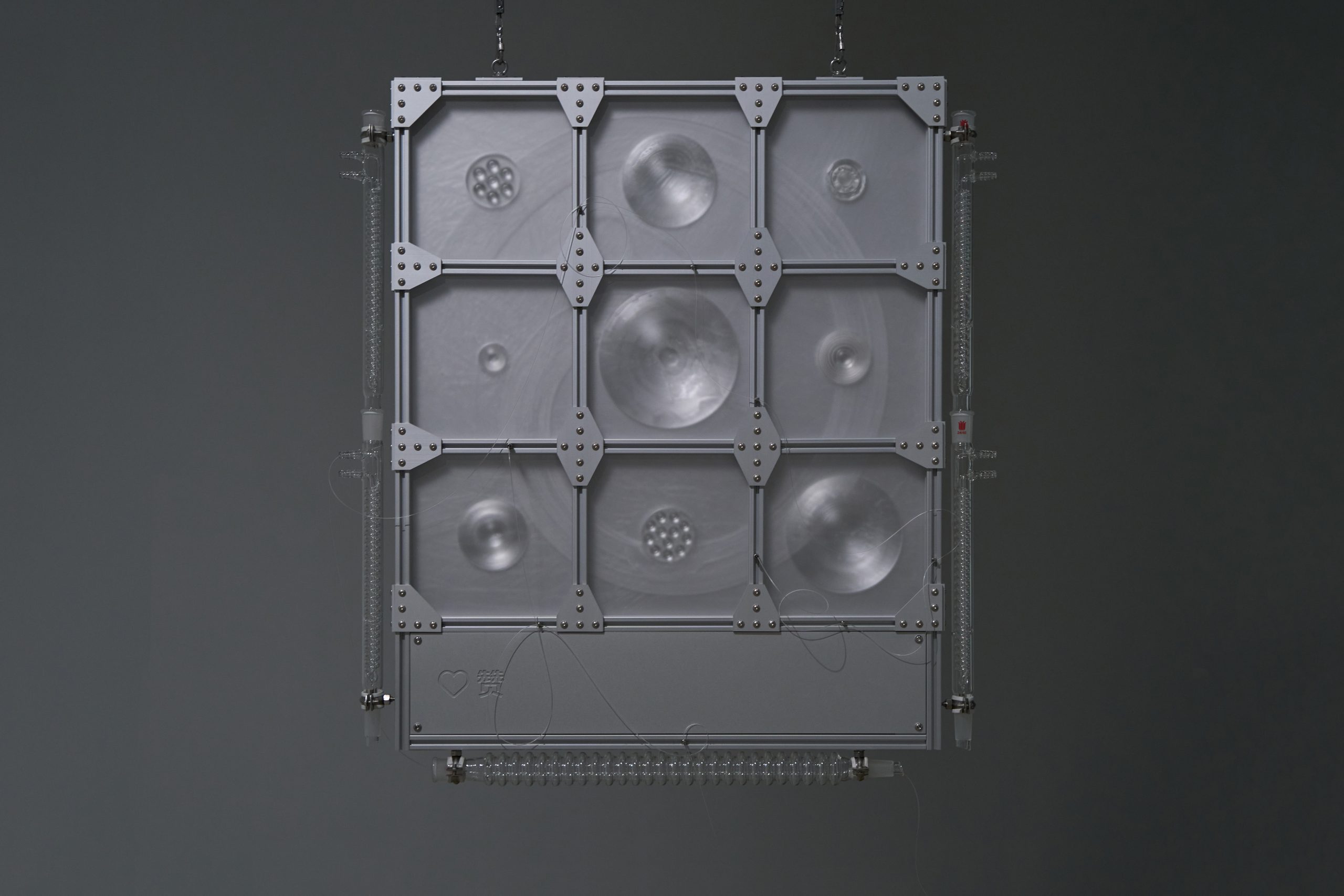Circular Interface consists of eight custom-built structural units. Each unit is assembled from aluminum profiles and CNC-milled aluminum panels forming a nine-grid framework. The front surface of each panel is precisely engraved with the Chinese character for Like (赞), echoing the ubiquitous Like button across social media. The nine grids are joined by multi-screw aluminum connectors, maintaining a strict and modular geometry — the structure resembles both a standardized social-media interface and the barred window of a cell. On the reverse side, a milled circular barbed-wire pattern serves as a visual emblem, hinting at the hidden mechanisms of control behind the interface. Beneath the seemingly gentle surface of social imagery lies a field of surveillance, discipline, and partitioned vision. Together, the eight units form a closed loop — a structural model of algorithmic circulation — enclosing the viewer within the space of the interface itself.