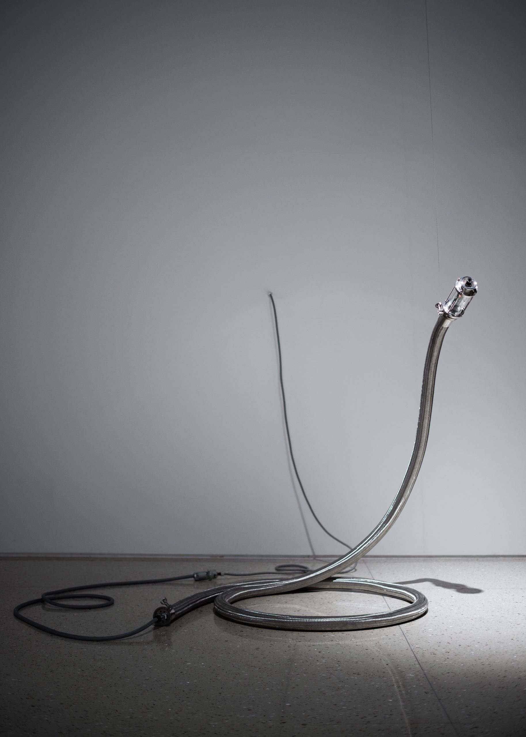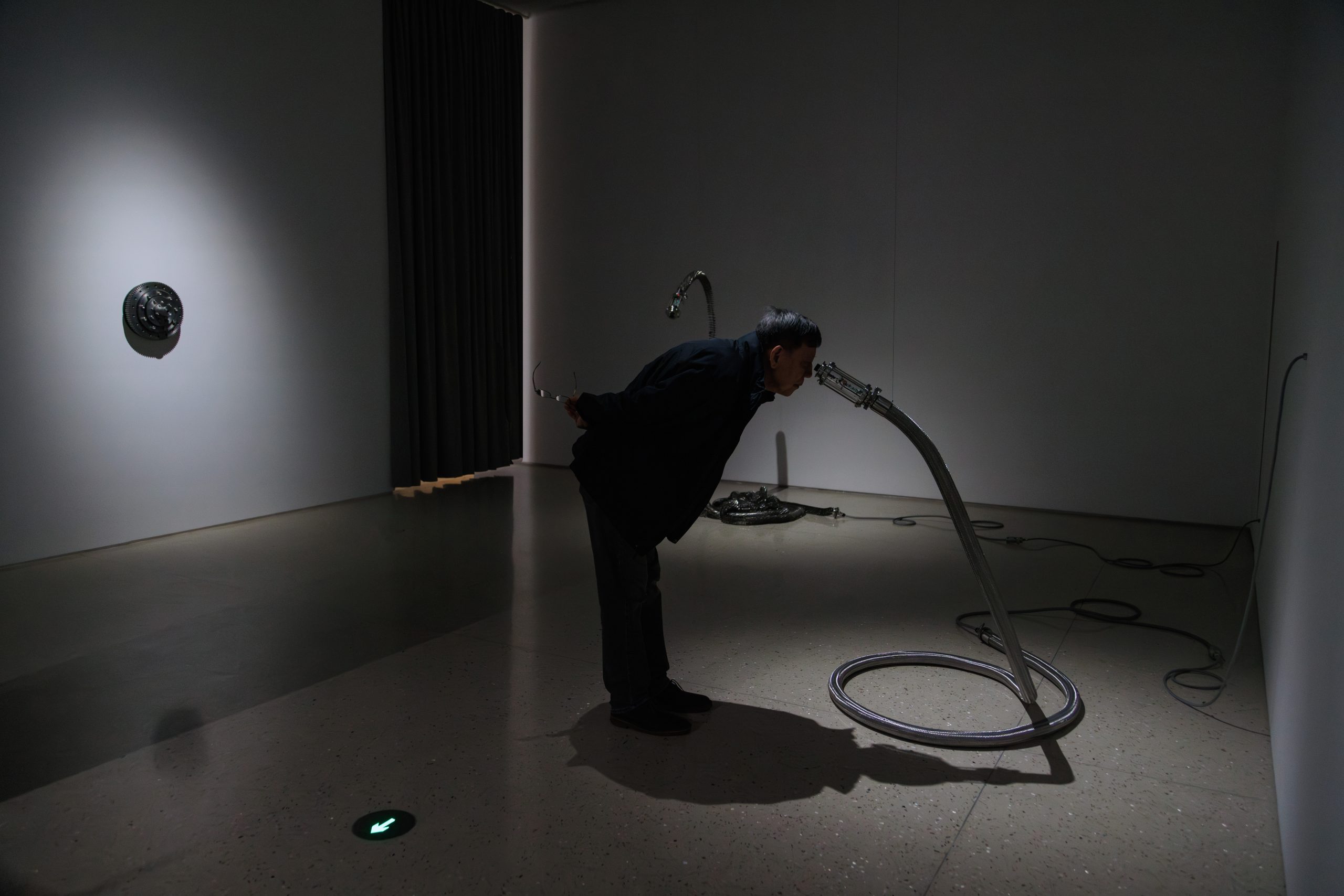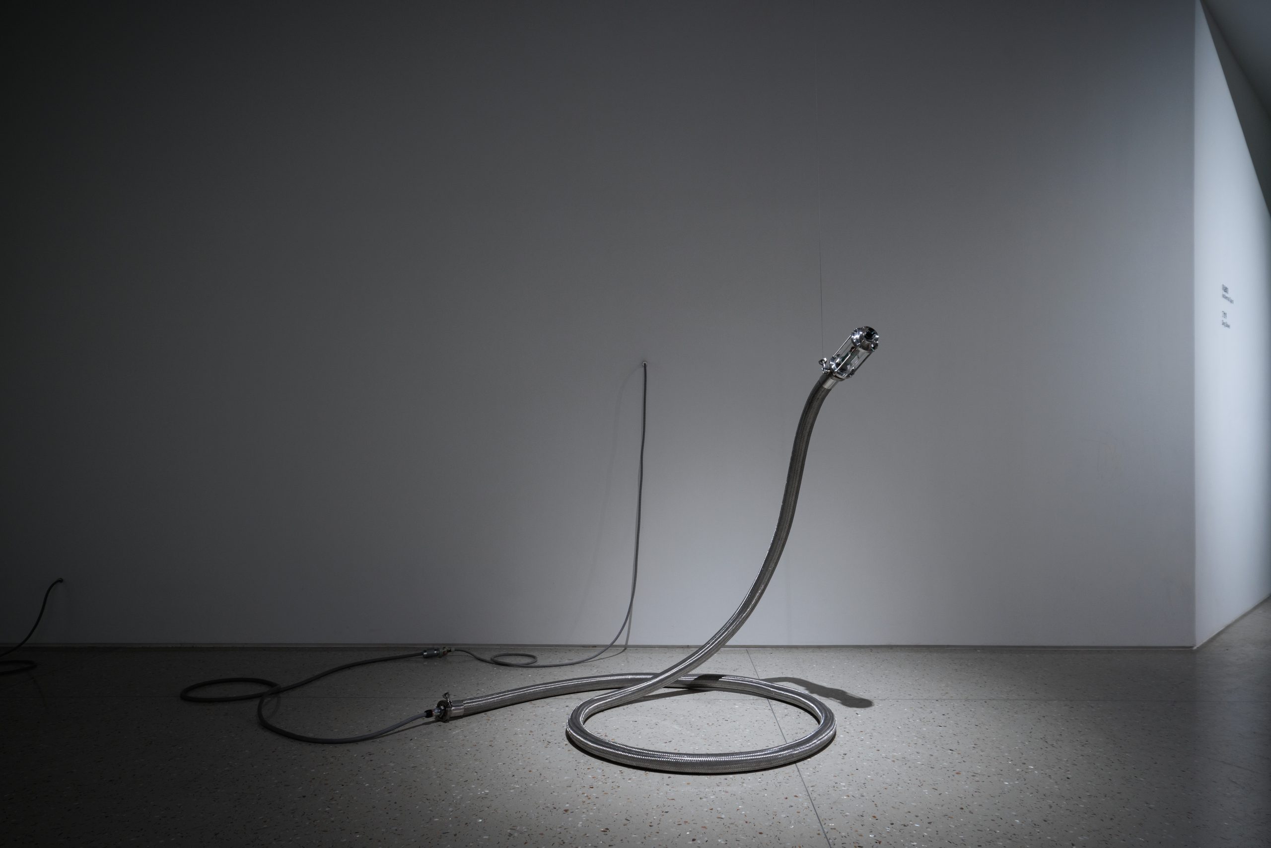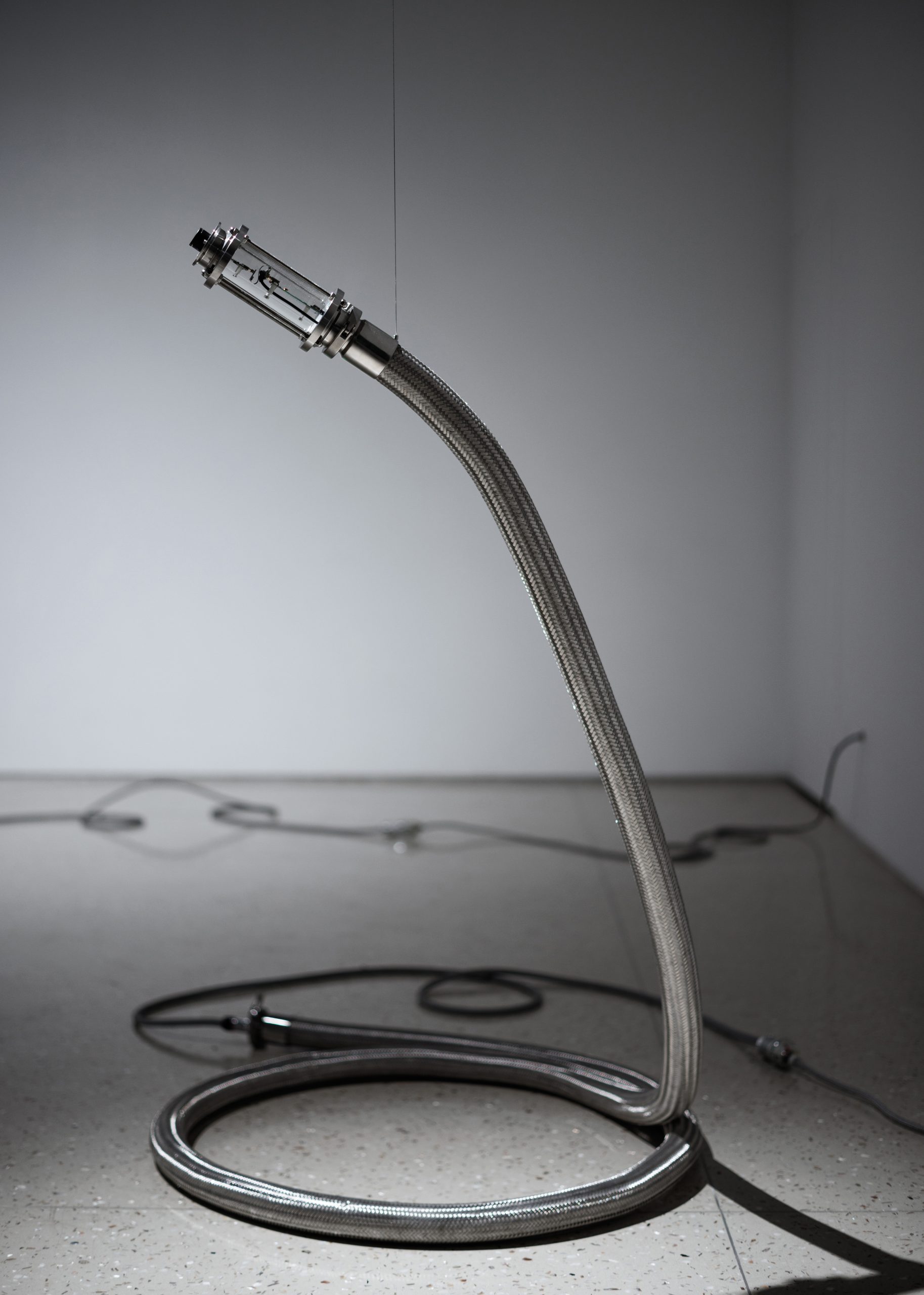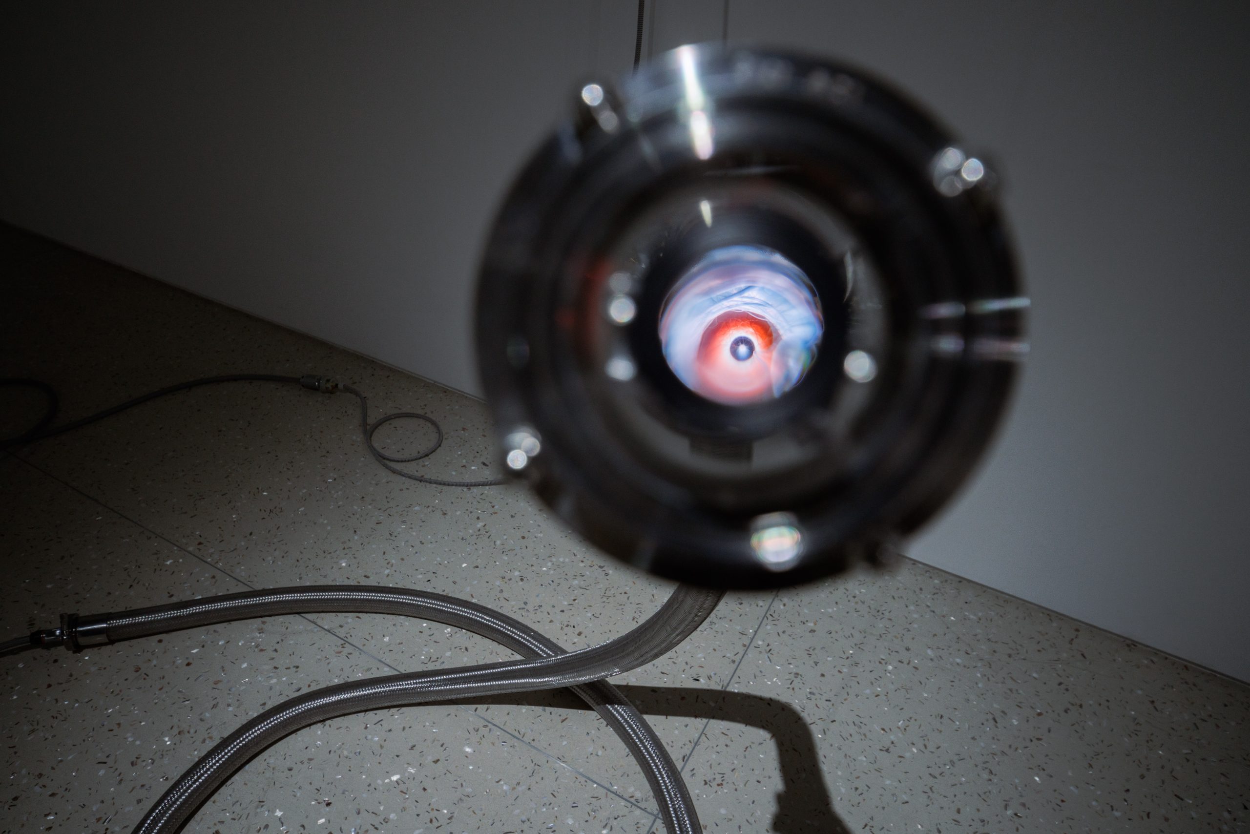 Spector’s Ventriloquism: Intra-vision is a micro video installation built upon the metaphor of seeing oneself. The viewer peers through a miniature optical probe embedded within a Tri-Clamp corrugated tube, a quick-seal industrial conduit whose polished metal interior evokes a sterilized bodily passage—an organ reshaped by protocols of hygiene and control.